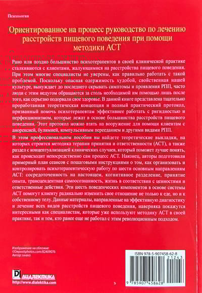 This manual, designed for professional therapists, focuses on the application of Acceptance and Responsibility Therapy (ACT) to eating disorders (ED). The book will be useful for those who are already practicing this methodology and for those who have not yet worked with ACT but wish to learn it. The book presents the theoretical conceptual foundations on which the ACT methodology is based, as well as applied recommendations for practitioners. Moreover, you will find a complete practical protocol and a sample session plan that will help you immediately apply the new methodology in working with this specific type of disorder. Sooner or later, most psychotherapists in their clinical practice encounter clients who complain of eating disorders. In doing so, many professionals are unsure of how to properly work with such a problem. Because our culture's dangerous obsession with thinness forces us to hide the symptoms and manifestations of an eating disorder until the last possible moment, people with this disorder often seek much-needed help only after they have seriously compromised their health. This book presents a thoroughly developed theoretical framework and a complete practical protocol to help psychotherapists work more effectively with the rigidity and perfectionism that underlie most eating disorders. This protocol can be adopted to help clients with anorexia, bulimia, compulsive overeating, and other types of RPD. In this professional manual, you will find the theoretical framework on which Acceptance and Responsibility Therapy (ACT) is based, as well as a case conceptualization section to help you better understand how the ACT process itself occurs. Finally, the authors have prepared a sample session plan with step-by-step instructions on how to organize and supervise psychotherapeutic work in the six core areas of ACT: present-centeredness, cognitive separation, acceptance of experience, transcendent self-awareness, living according to values, and responsible action. These six behavioral components at the core of the ACT framework will help the client radically change their relationship not only to food, but also to their own body. These materials, aimed at effective diagnosis and treatment of all types of eating disorders, are sure to be of interest both to professionals who already use ACT in their practice and to those who have not previously worked with this revolutionary approach.