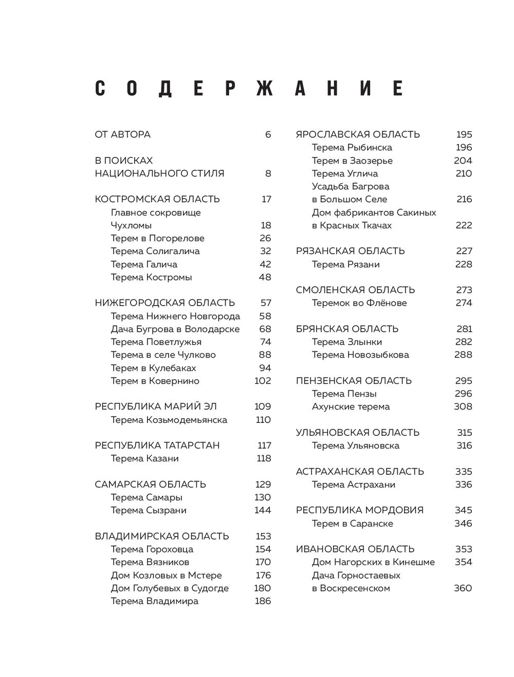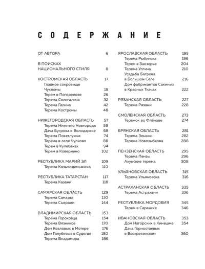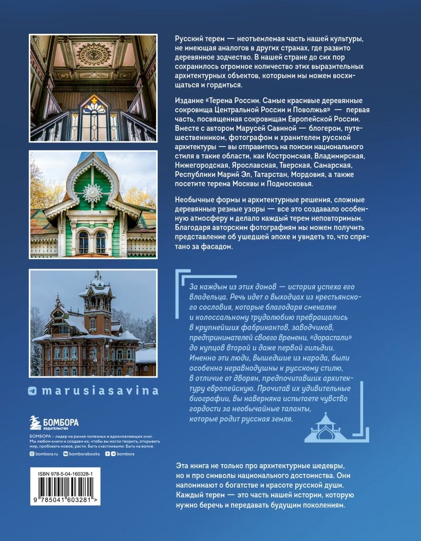 Russian terem is an integral part of Russian culture, which has no analogues in other countries where wooden architecture is developed. Russia still has a huge number of these expressive architectural objects, which we can admire and be proud of. The publication "Teremas of Russia. The Most Beautiful Wooden Treasures of Central Russia and the Volga Region" is dedicated to the incredible treasures of Central and European Russia. Together with the author, Marusya Savina - blogger, photographer, researcher and keeper of Russian architecture, you will go in search of national style in such regions as Kostroma, Vladimir, Nizhny Novgorod, Yaroslavl, Tver, Samara, the Republics of Mari El, Tatarstan, Mordovia, as well as visit the terems of Moscow and the Moscow region. Unusual shapes and architectural solutions, complex wooden carved patterns - all this created a special atmosphere and made each terem unique. Thanks to the author's photographs we can get an idea of the bygone era and see what is hidden behind the facade. This book is not only about architectural masterpieces, but also about symbols of national dignity. They remind us of the richness and beauty of the Russian soul. Each terem is a part of our history, which should be preserved and passed on to future generations.