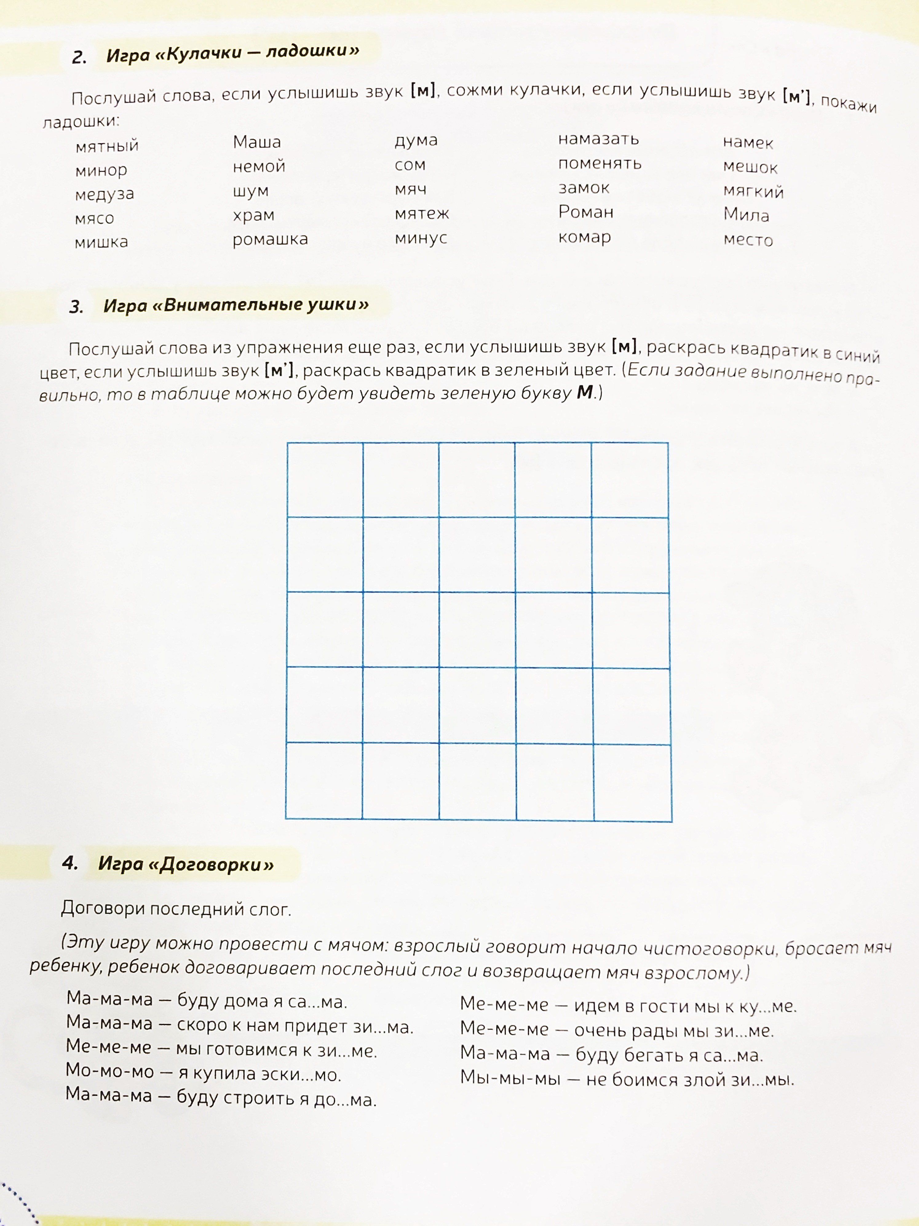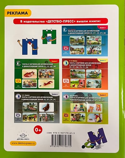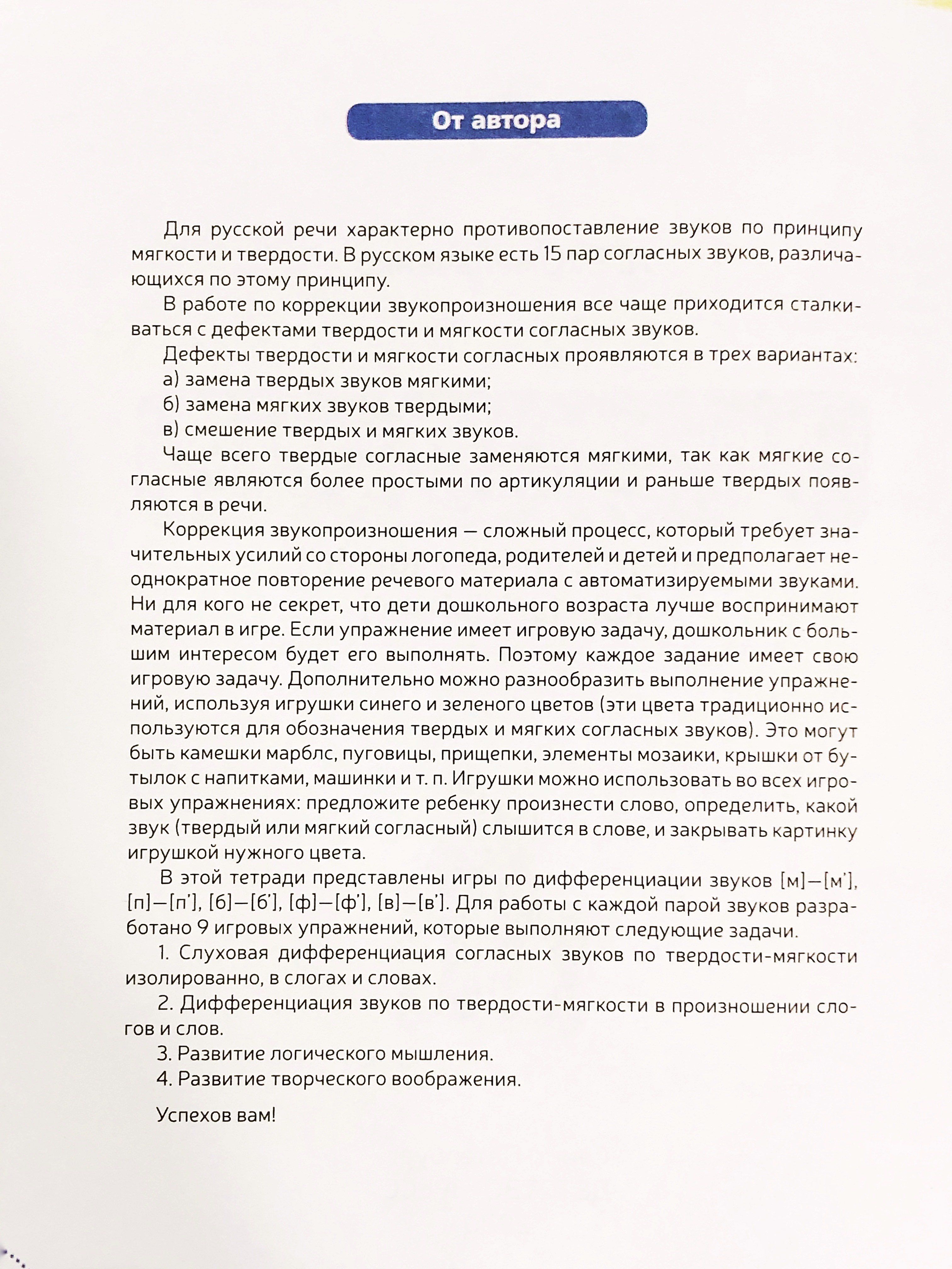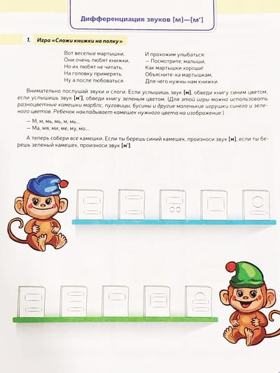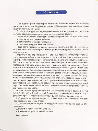 The manual contains exercises for differentiating the sounds [m]-[m'], [p]-[p'], [b]-[b'], [f]-[f'], [c]-[c']. All exercises of the manual have a playful task, which stimulates the child's desire to perform them. A variety of lexical and pictorial material of the manual will help to learn the correct pronunciation of the studied sounds, and will also contribute to the development of creative imagination, memory and thinking.