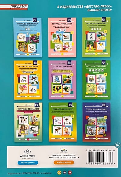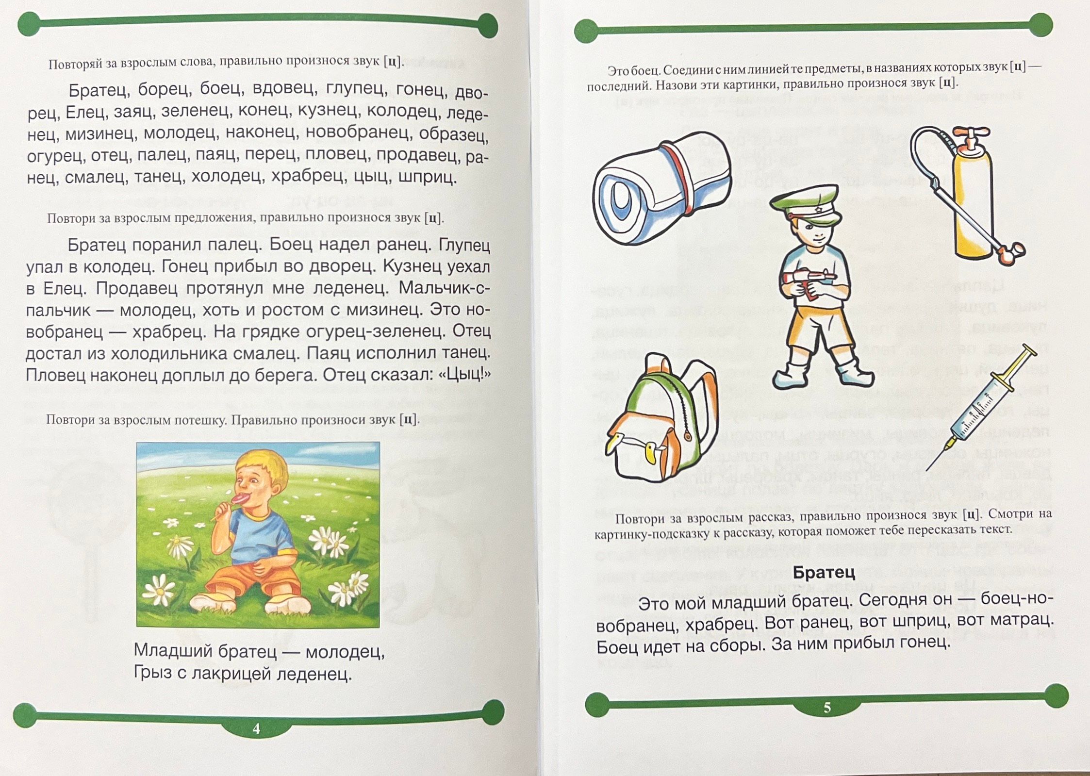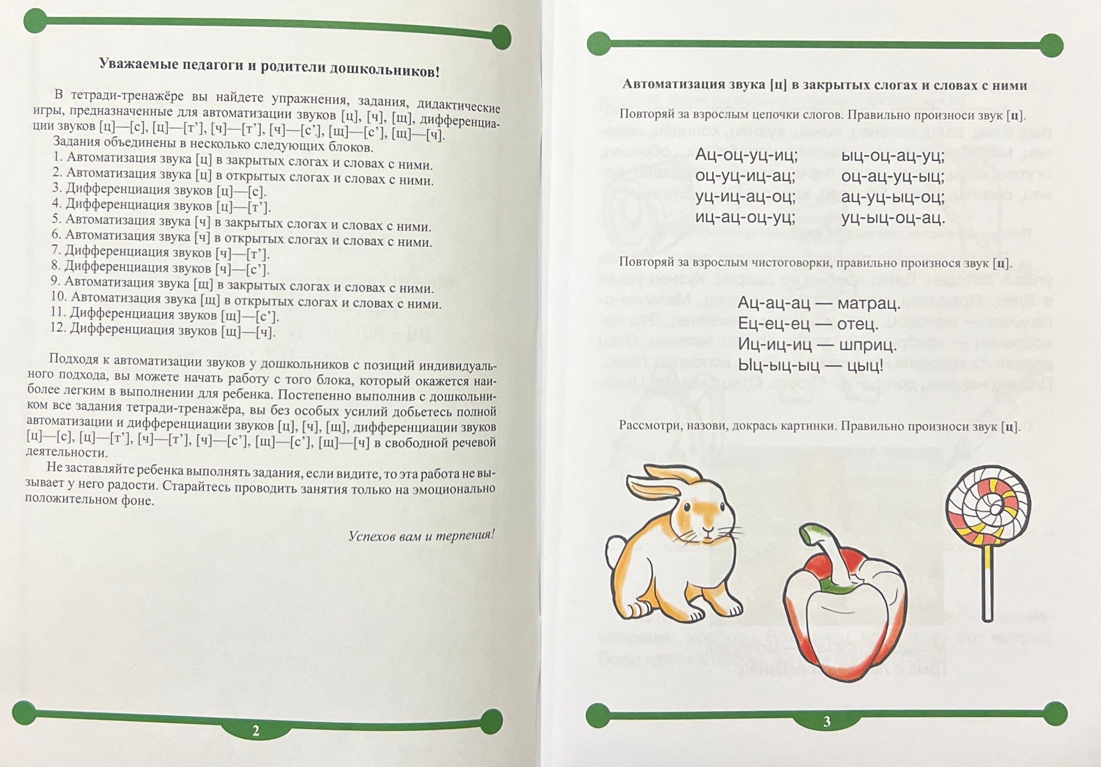 The exercise book contains exercises and game tasks for automating the pronunciation of the sounds [ts], [ch], [ch], [ch], differentiation of the sounds [ts]-[s], [ts]-[t'], [ch]-[t'], [ch]-[s'], [ch]-[s'], [ch]-[ch]. The child can perform the tasks of the notebook under the guidance of an adult. It is addressed to teachers and speech therapists, teachers of ECE centers, institutions of additional education and parents of preschool children.