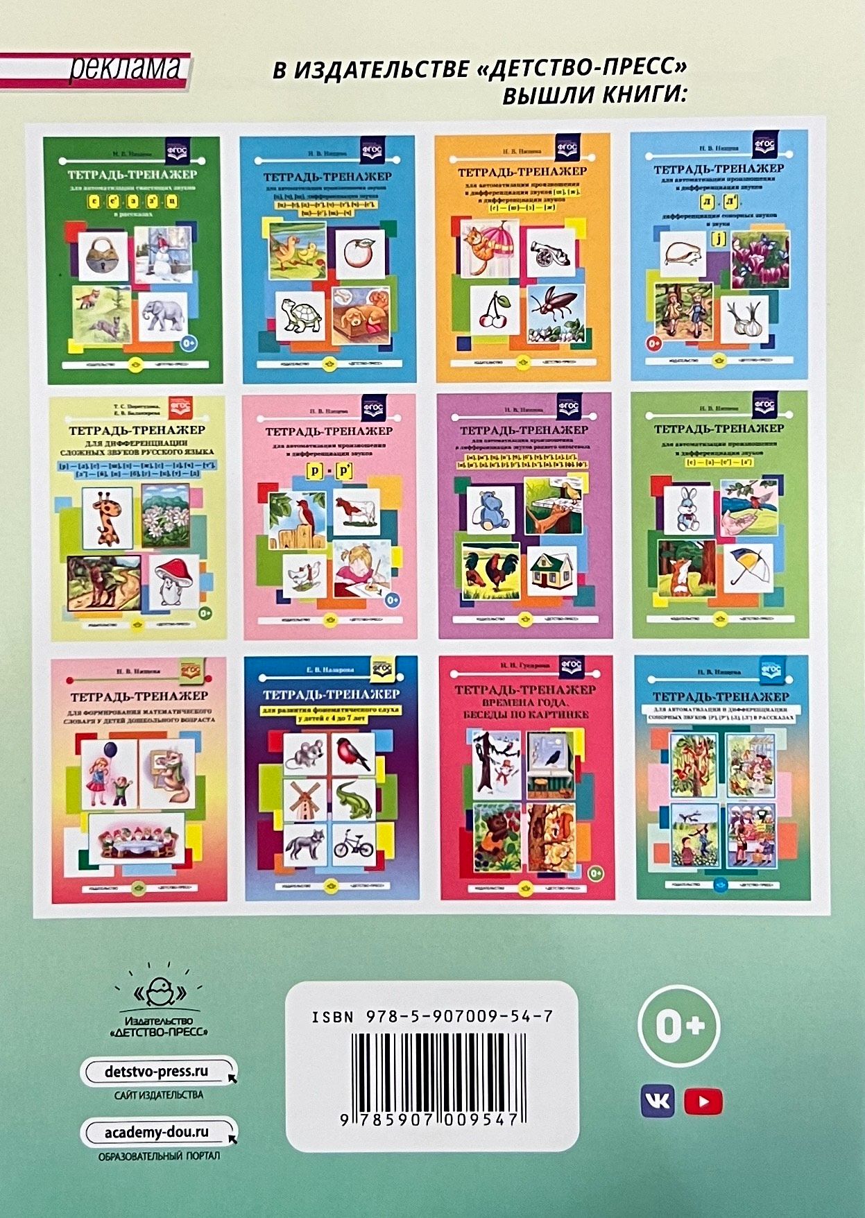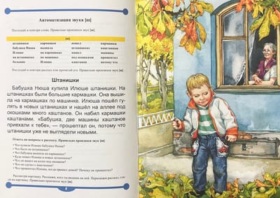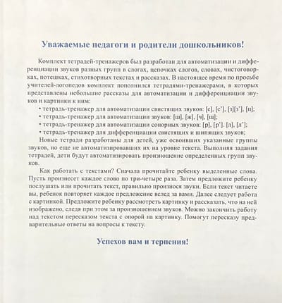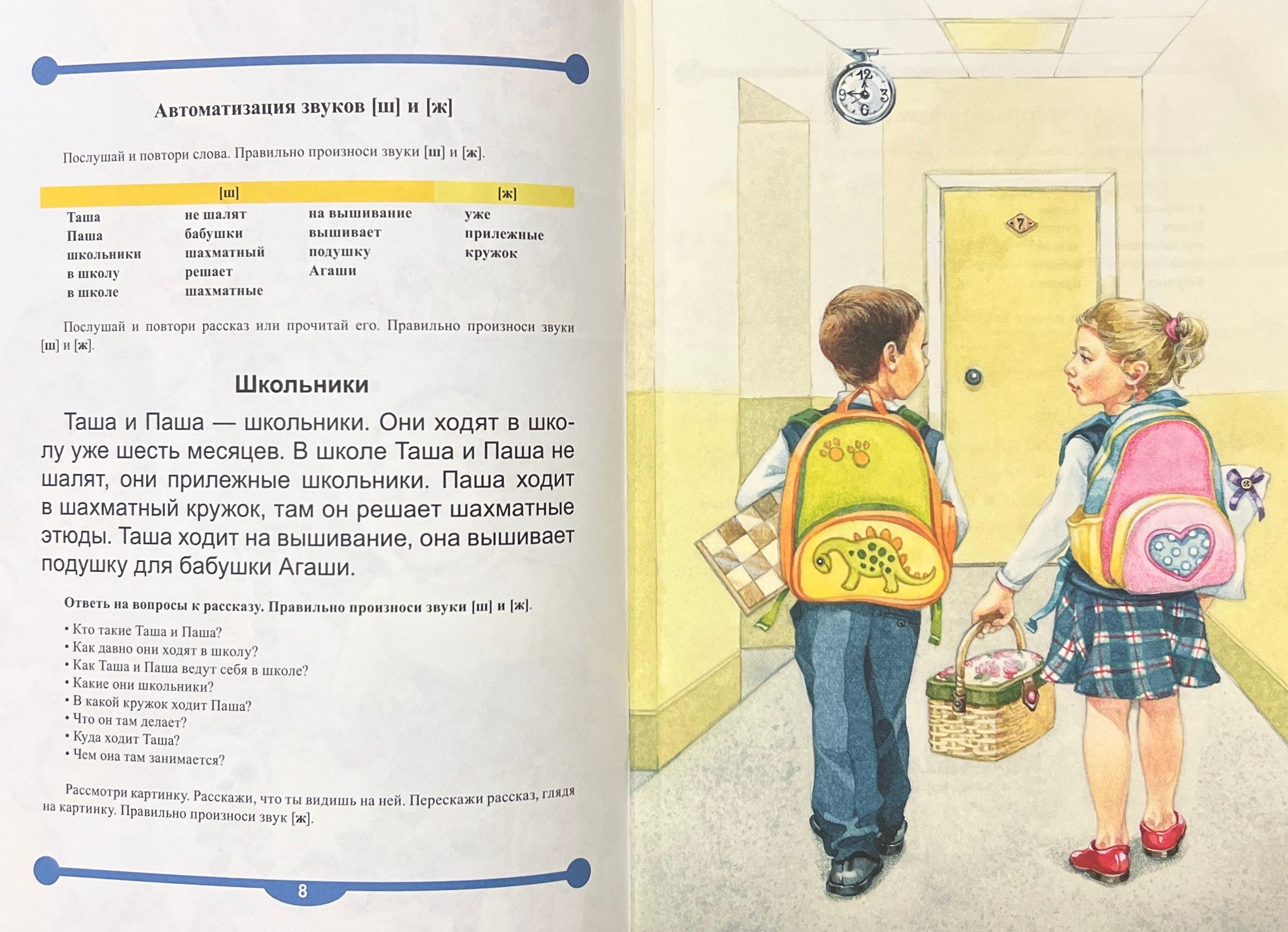 In the notebook there are texts and pictures to them for automation of sounds: [sh], [g], [h], [sh]. For each story, words are given, the pronunciation of which must be worked out before working on the text. Considering the picture, the child tells what is depicted on it and correctly pronounces the sounds. Completes the work on the text retelling based on the picture. For reading children, a type of work such as audio automation when reading text is added.