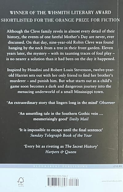 Twelve-year-old Harriet is doing her best to grow up, which is not easy as her mother is permanently on medication, her father has silently moved to another city, and her serene sister rarely notices anything. All of them are still suffering from the shocking and mysterious death of her brother Robin twelve years earlier, and it seems to Harriet that the family may never recover. So, inspired by Captain Scott, Houdini, and Robert Louis Stevenson, she sets out with her only friend Hely to find Robin's murderer and punish him. But what starts out as a child's game soon becomes a dark and dangerous journey into the menacing underworld of a small Mississippi town.