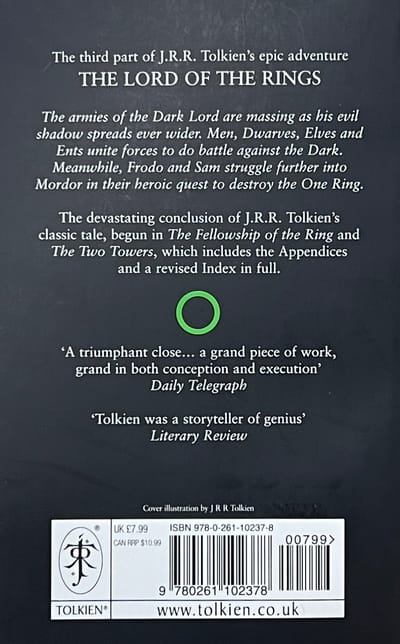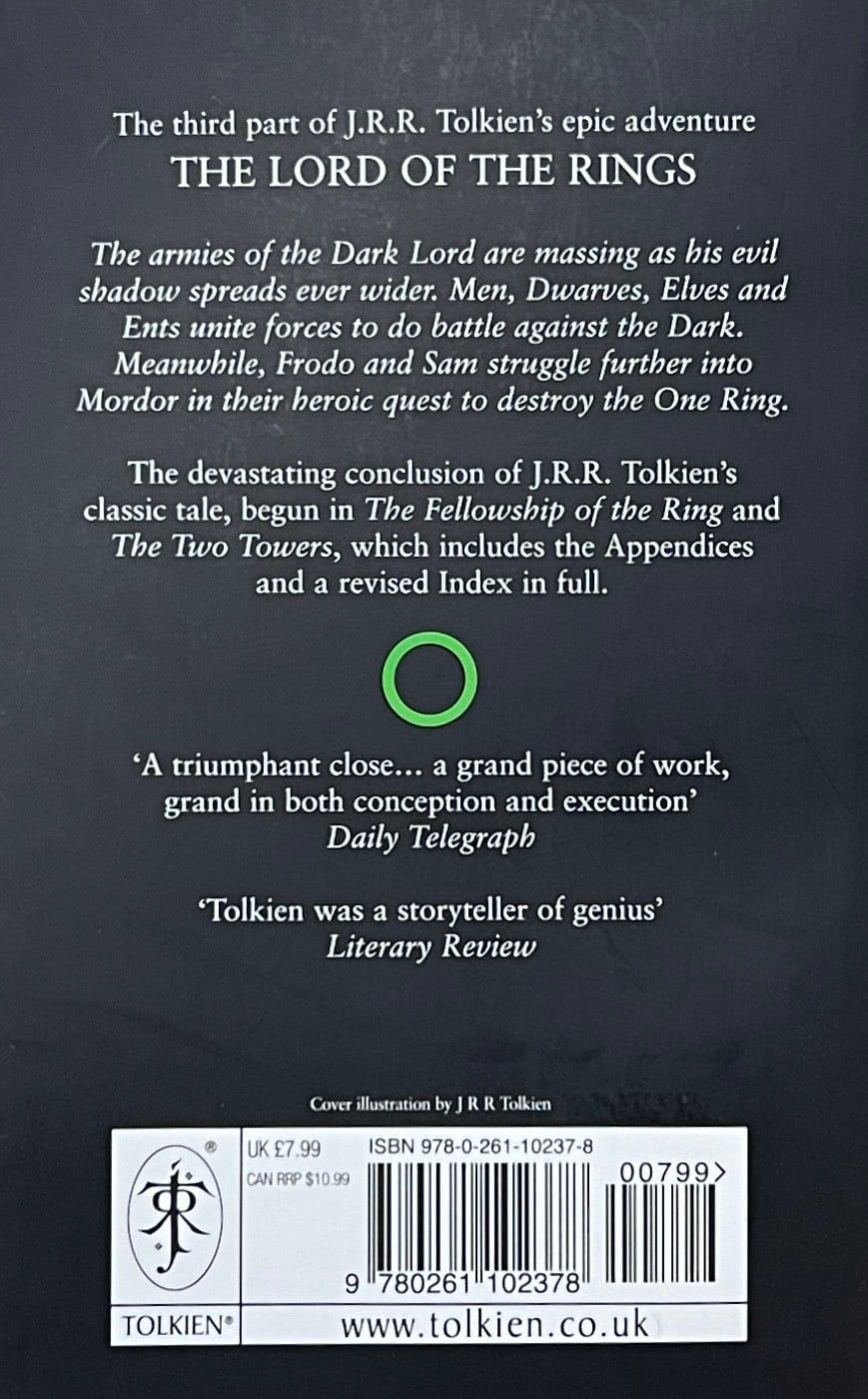 The armies of the Dark Lord are massing as his evil shadow spreads even wider. Men, Dwarves, Elves and Ents unite forces to battle against the Dark. Meanwhile, Frodo and Sam struggle further into Mordor in their heroic quest to destroy the One Ring.The devastating conclusion of J.R.R. Tolkien’s classic tale of adventure, begun in The Fellowship of the Ring and The Two Towers.