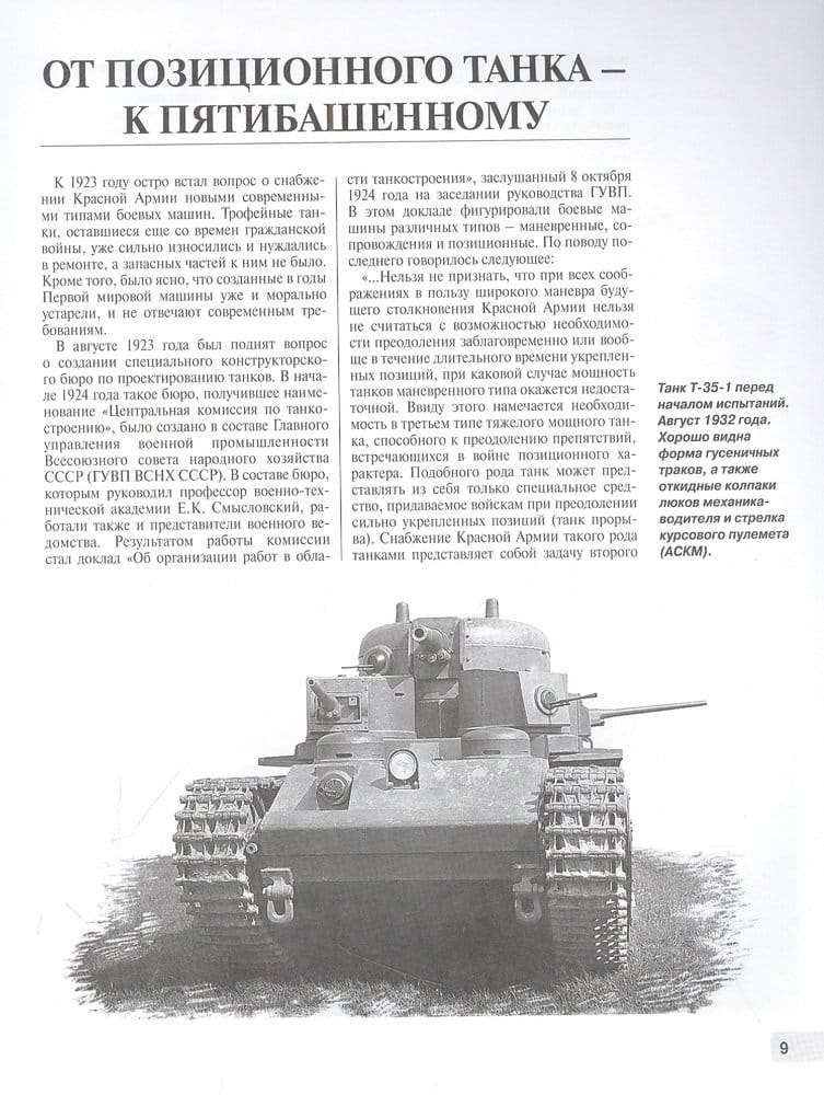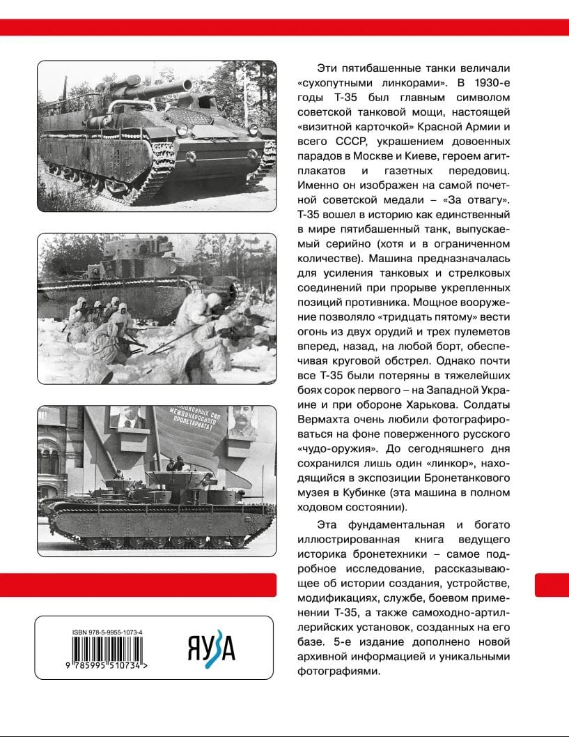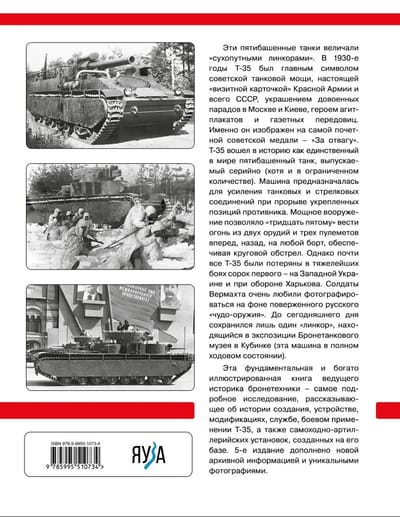 These five-tank tanks were called "land battleships". In the 1930s, the T-35 was the main symbol of Soviet tank power, a real "calling card" of the Red Army and the entire USSR, a decoration of pre-war parades in Moscow and Kiev, a hero of agitprop posters and newspaper editorials. It is depicted on the most honorable Soviet medal - "For Bravery". The T-35 went down in history as the only five-tank tank in the world to be mass-produced (albeit in limited numbers). The vehicle was intended to reinforce tank and rifle formations when breaking through fortified enemy positions. Powerful armament allowed the "thirty-fifth" to fire from two guns and three machine guns forward, backward, on either side, providing a circular fire. However, almost all T-35s were lost in the heaviest battles of the forty-first - in Western Ukraine and during the defense of Kharkov. The Wehrmacht soldiers liked to take pictures on the background of the defeated Russian "miracle weapon". Only one "battleship" survived until today, which is in the exposition of the armored museum in Kubinka (this machine is in full running condition). This fundamental and richly illustrated book by a leading historian of armored vehicles is the most detailed study of the history of creation, design, modifications, service, combat use of the T-35, as well as self-propelled artillery units created on its basis. The 5th edition is supplemented with new archival information and unique photographs.