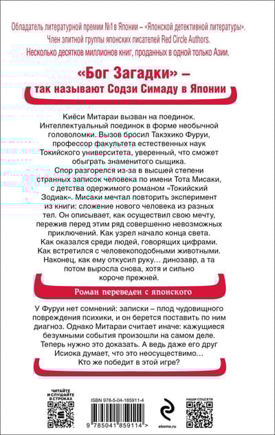 A mystery steeped in madness. Kiyoshi Mitarai is challenged to a duel. An intellectual duel in the form of an unusual puzzle. The challenge is challenged by Takehiko Furui, a professor at Tokyo University's Faculty of Natural Sciences, who is confident that he can beat the famous detective. The dispute arose from the highly bizarre notes of a man named Tota Misaki, who had been obsessed with the novel Tokyo Zodiac since childhood. Misaki dreamed of repeating an experiment from the book: putting together a new person from different bodies. He describes how he realized his dream through a series of impossible adventures. How he saw the beginning of the end of the world. How he found himself among people who speak in numbers. How he encountered humanoid animals. Finally, how his arm was bitten off by... a dinosaur, and then grew back, albeit much shorter than before. Furui has no doubt that the notes are the product of a monstrously damaged psyche, and he undertakes to diagnose them. Mitarai, however, believes otherwise: the seemingly insane events actually happened. Now he has to prove it. And even his friend Ishioka thinks it's impossible... Who will win this game? "God of Mystery" - that's what they call Soji Shimada in Japan. Winner of Japan's #1 literary prize, the Japan Detective Literature Award. Member of the elite group of Japanese writers Red Circle Authors. Several tens of millions of books sold in Asia alone.