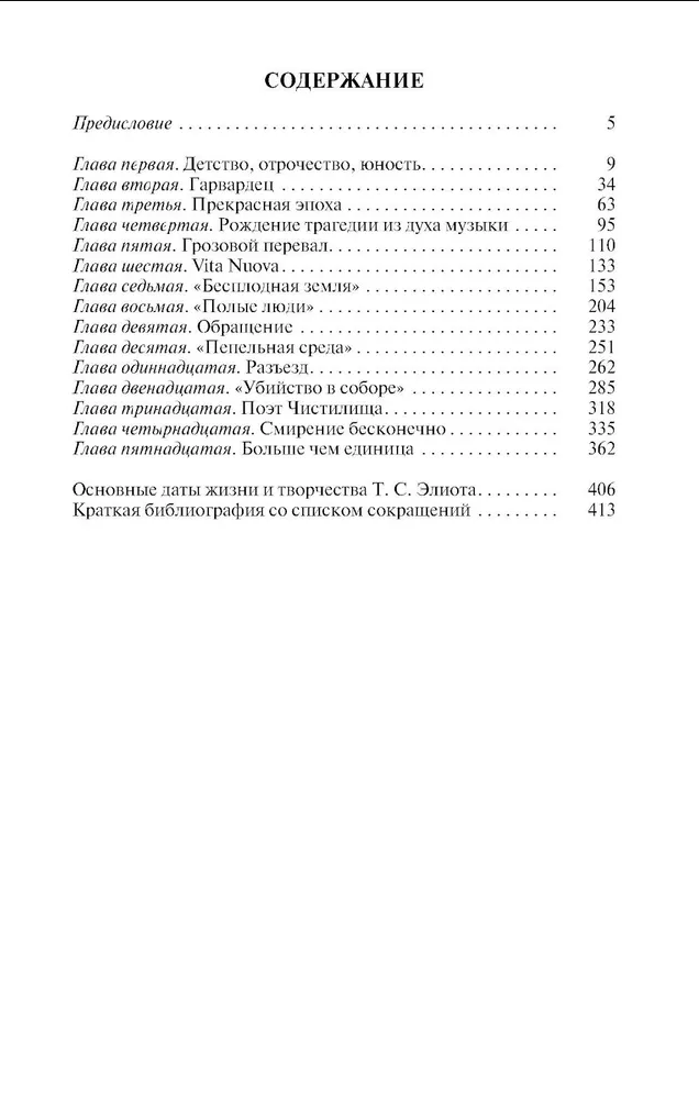 The work of the poet, playwright and critic, Nobel laureate Thomas Sturns Eliot (1888-1965), which had a profound impact on modern Western culture, is woven from contradictions, as is his biography. Belonging to the American elite, he did not get along in his native country and went to England, where he ended his days. Considered an extreme modernist, he constantly turned to the distant past and the faith lost by his contemporaries. Famous for the elitism and complexity of his poems, he willingly let topical topics and colloquial speech into them. The first detailed biography of Eliot in Russian clearly demonstrates how closely his life and work are connected, forming a kind of ring, to which the poet himself dedicated the famous line - "In my beginning my end.".