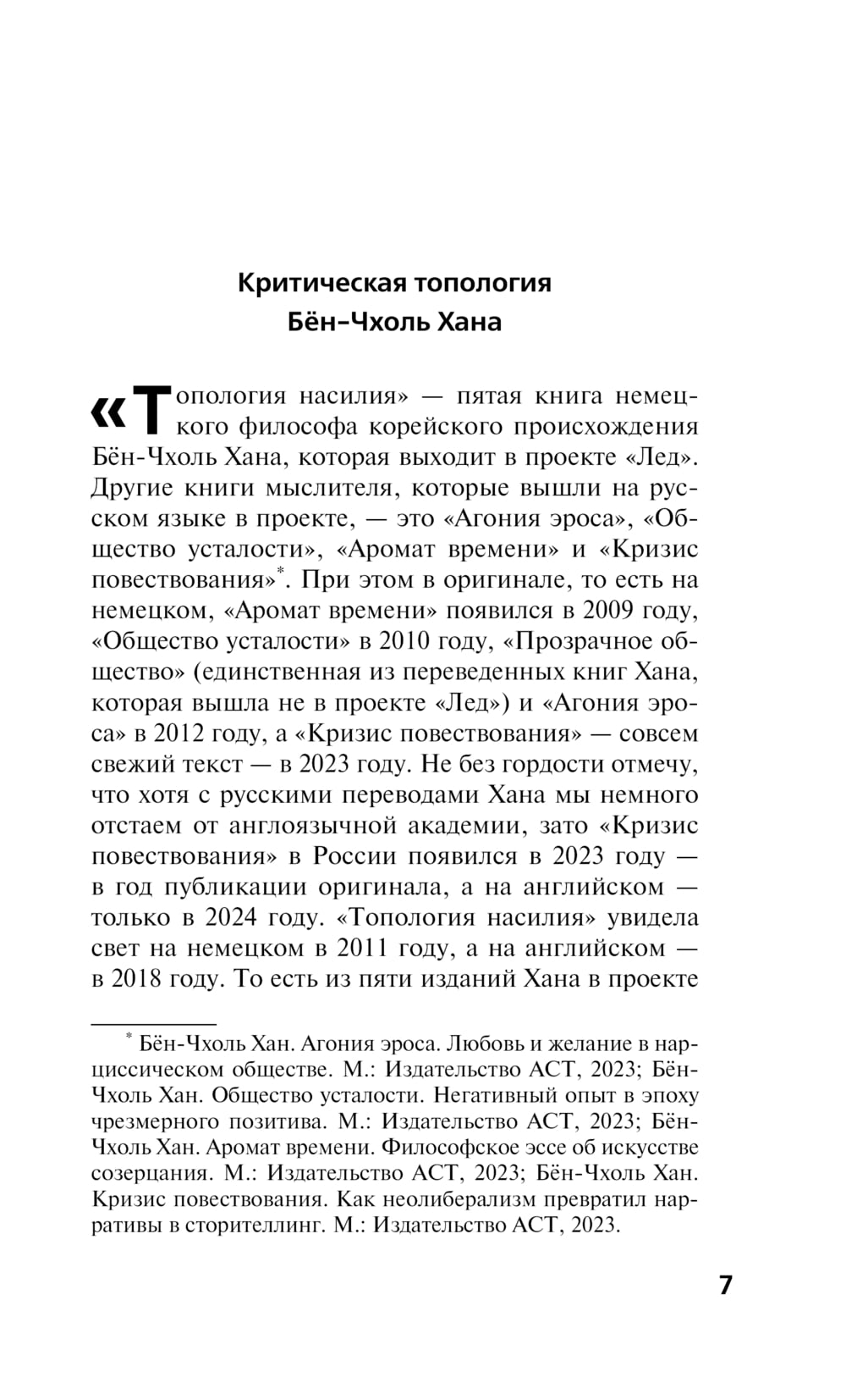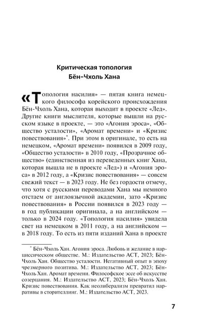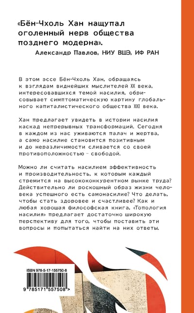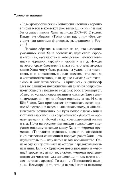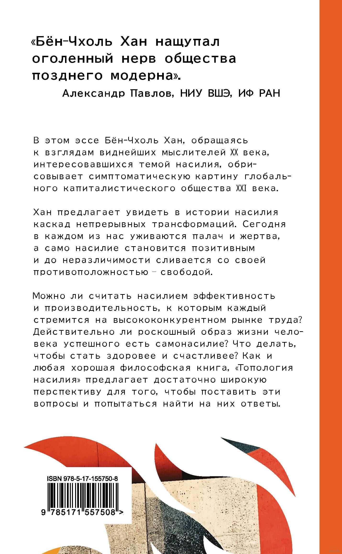 Khan proposes to see the history of violence as a cascade of continuous transformations. Today, the executioner and the victim coexist in each of us, and violence itself becomes positive and merges indistinguishably with its opposite, freedom. Can the efficiency and productivity that everyone strives for in a highly competitive labor market be considered violence? Is the luxurious lifestyle of a successful person really self-violence? What should one do to become healthier and happier? Like any good philosophical book, The Topology of Violence offers a broad enough perspective to pose these questions and try to find answers.