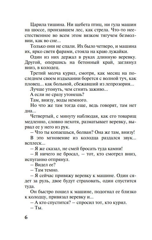 There were four of them... Three of them were already dead. Only she remained, Polina Karoteeva. She was still alive. But someone wanted her dead, too. Katya Petrovskaya, a crime reporter for the Moscow Region Main Directorate of Internal Affairs Press Center, tried to get Polina to open up, to finally learn the truth about that old crime, when Zhenya Lazarev, bound and horribly wounded, died in an abandoned well... What really happened several years ago, and which of the four was the real killer? And why, after so much time, did someone start killing off, one after another, all the participants in that horrific case? Finally, Polina opened up, told him what happened that fateful night. She told him... and ten minutes later, she died at the killer's hands. But he wasn't satisfied with that. This isn't the end...