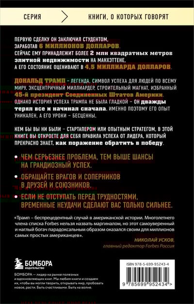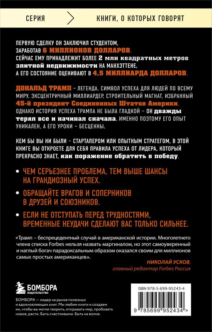 Whether you are a startup or an experienced strategist, in this book you will discover the rules of success from a leader who knows perfectly well how to turn defeat into victory. Following Donald Trump's leadership lessons, you will be able to find a way out of a difficult situation in your career and business and turn your problems into real success.