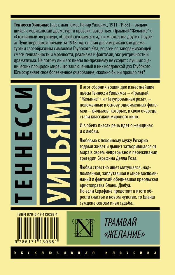 This collection includes two of Tennessee Williams' most famous plays - "A Streetcar Named Desire" and "The Tattooed Rose" - based on the films of the same name - films that, in turn, have become classics of world cinema. And both plays are about women and love. Love for her late husband Rosario lives and breathes for years shut away from the world in her continuous experience of tragedy Serafina Della Rosa. Blanche Dubois, an impoverished Creole aristocrat, who is lost in a world of memories and fantasies, is passionately seeking love. But if Serafina will eventually find happiness in a new feeling, Blanche is destined for a very different fate....