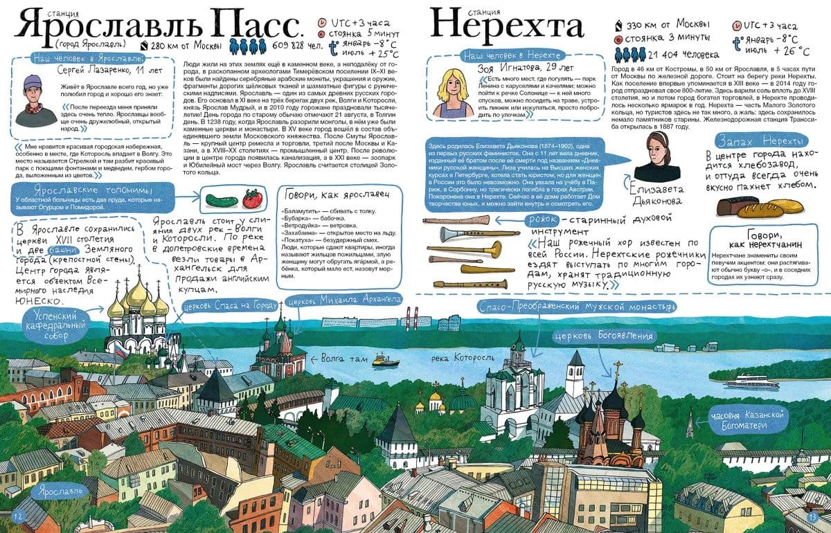 Figures, historical facts and information about geography, which can be found in textbooks, were supplemented by real stories of people connected with Transsib, stories about favorite places, recipes of dishes and tips on what to see, which were generously shared by children and adults. These stories were collected, facts were selected, panoramas and sketches from megacities and small towns were created by Alexandra Litvina and Anya Desnitskaya, the creators of the famous book "The Story of an Old Apartment", a real event on the Russian and international book market, winners of many Russian and international awards.