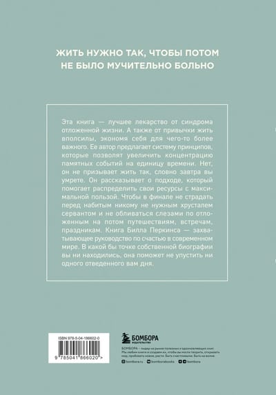 This book is the best cure for the postponed life syndrome. And also from the habit of living half-heartedly, saving yourself for something more important. Its author offers a system of principles that will increase the concentration of memorable events per unit of time. No, he doesn't call for living as if you were going to die tomorrow. He talks about an approach that helps to distribute your resources to the maximum benefit. So that in the end you don't suffer in front of a cupboard full of crystal that no one needs and don't shed tears over trips, meetings, and holidays postponed for later. Bill Perkins' book is a fascinating guide to happiness in the modern world. No matter where you are in your own biography, it will help you not to miss a single day.