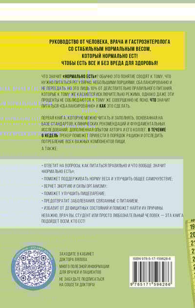 What does it mean to "eat normally"? Usually this concept is reduced to the fact that you need to eat regularly, in small portions, in a balanced way and not overeat. But this is only 10% of a truly healthy diet, which, moreover, concerns exclusively the regime. However, even these percentages are not observed. In addition, it is completely unclear what it means to eat "balanced" and How to do it. The first book that can be read and filled out, based on standards, clinical recommendations and fundamental research, supplemented by the experience of the author and his colleagues.