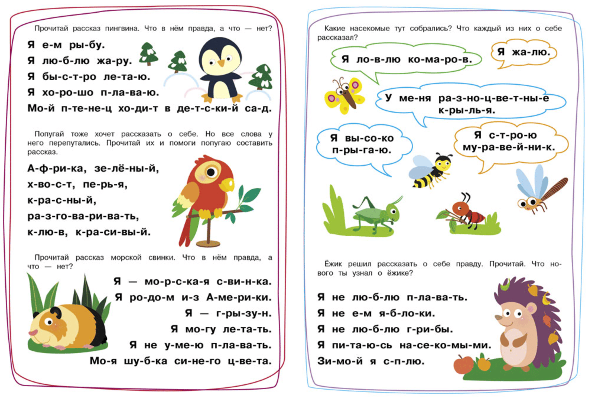 This activity requires children to not only read sentences and phrases but also complete tasks. This will motivate them to read and help them understand why they need to read—to learn new things. Furthermore, completing the tasks will help develop their speech, logic, attention, and memory skills. They will gain a wealth of knowledge about the world around them and learn to perform various mental operations, such as comparison, analysis, synthesis, and so on. Thus, each activity not only trains their reading skills but also makes the learning process more holistic, presenting them with several challenges at once, while also turning the exercises into a fun game.