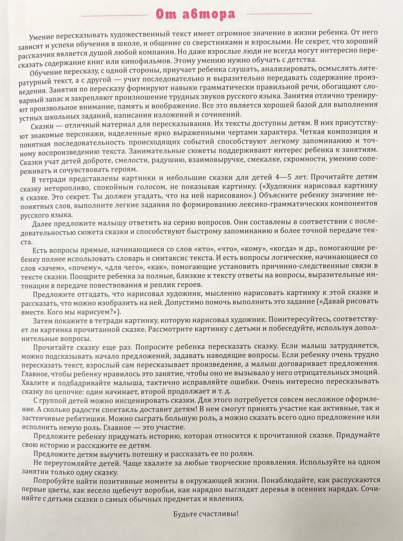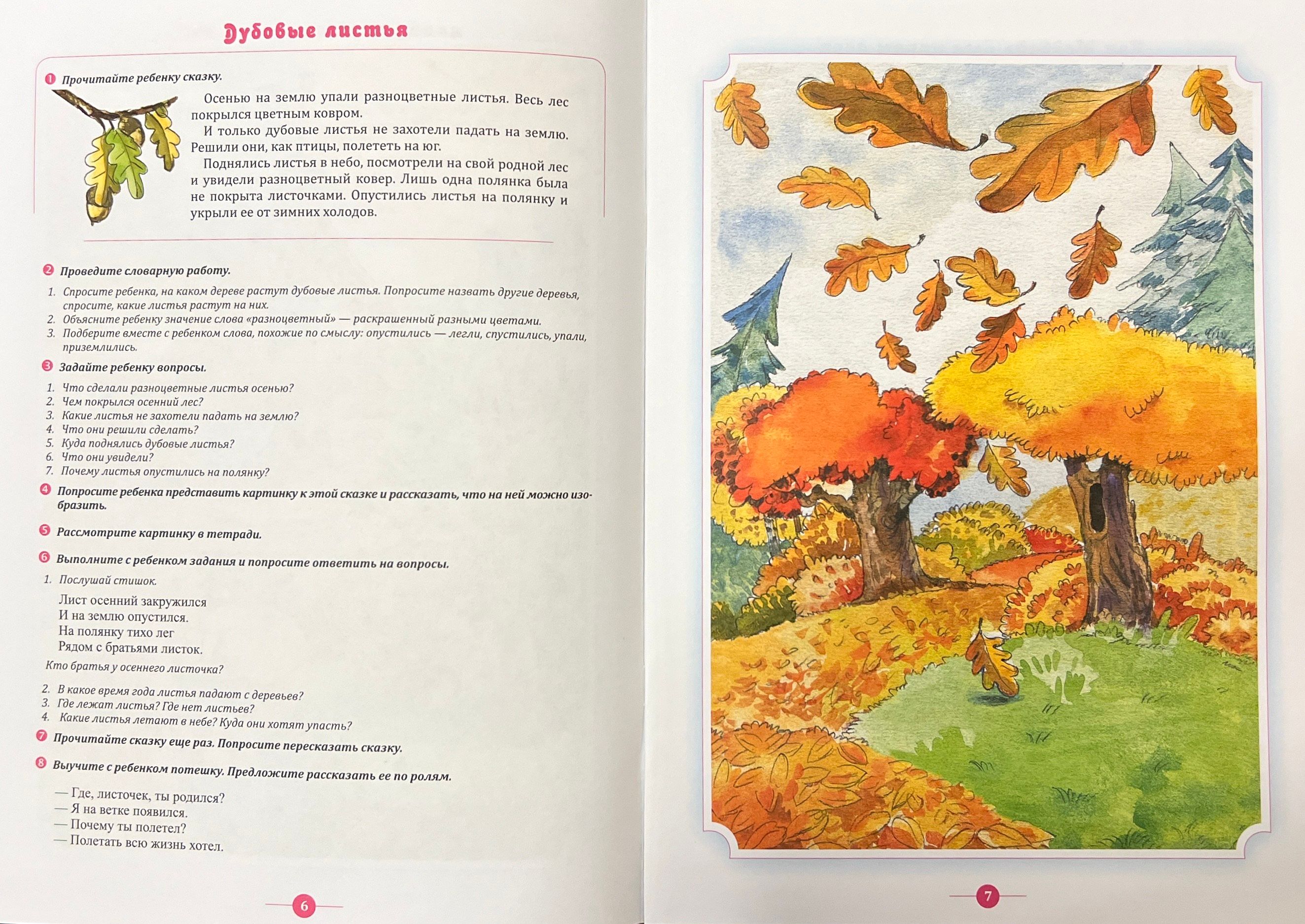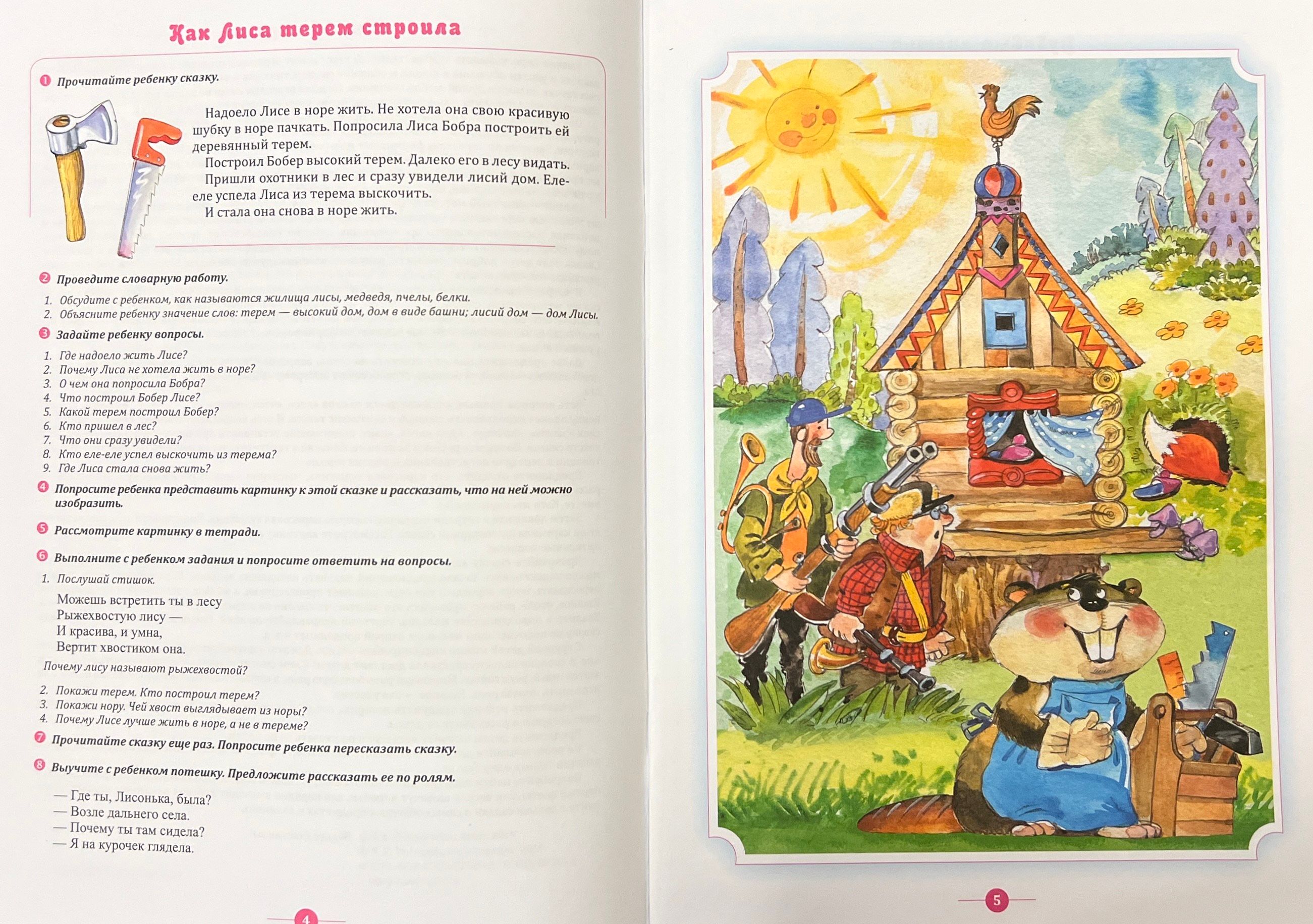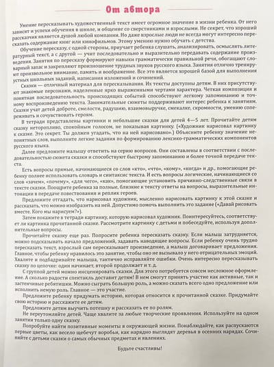 The notebook presents elegant and small samples of literary creativity, the plot basis of which is formed by objects and phenomena of the surrounding world, wonderful pictures to these plots and the author's methodological recommendations for conducting trainings on the formation of coherent speech in preschoolers on the basis of fairy tales. The manual contains tasks for the development of creative abilities of children, questions to prepare for retelling. Characters of fairy tales are familiar to children, it supports interest to lessons. And the ability to pay attention to pleasant little things in ordinary life has a positive effect on children's psyche. The notebook can be used as a collection of exercises not only for the development of coherent speech of the child, but also for moral education, the formation of socially acceptable forms of behavior. The knowledge and skills acquired by children are necessary to prepare them for schooling. The publication is intended for teachers working with children aged 4-5, as well as for parents of preschoolers.
