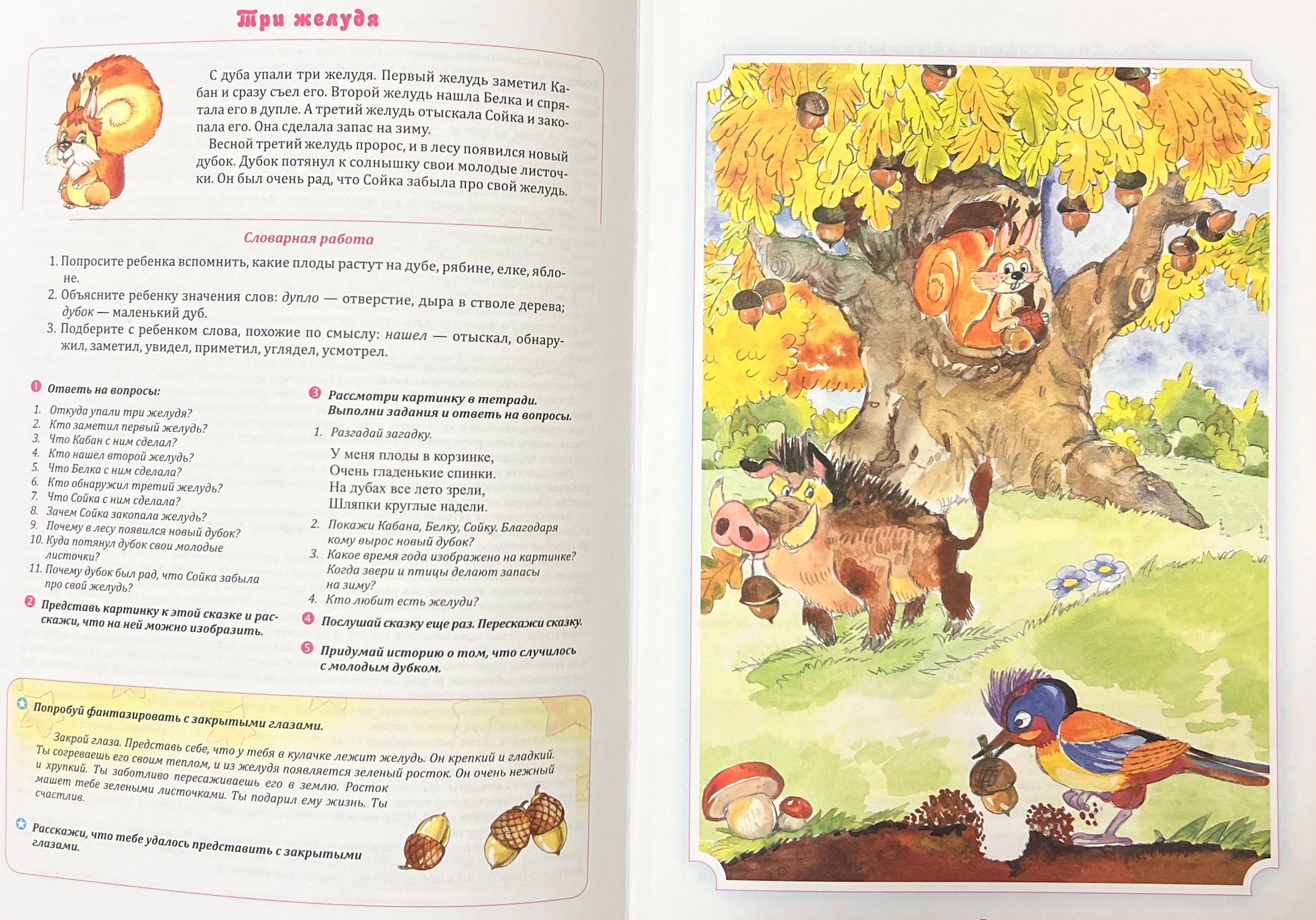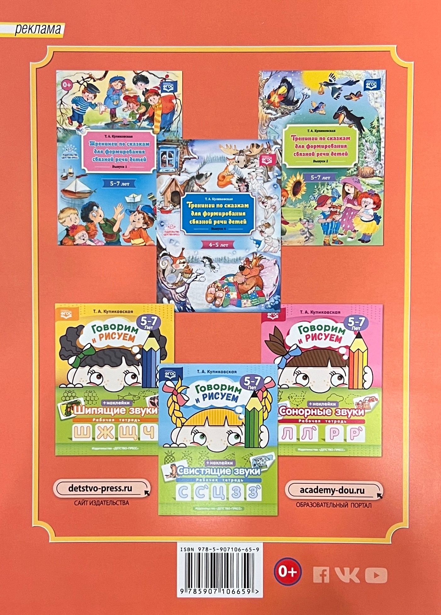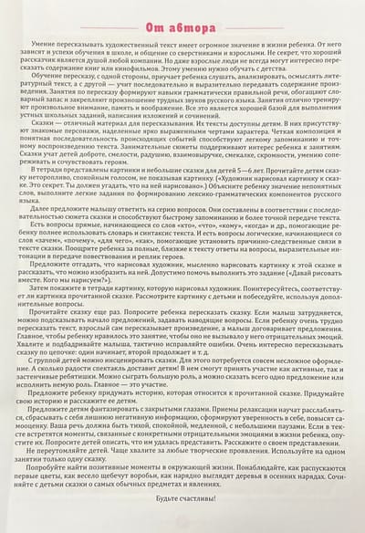 The notebook presents elegant and small samples of literary creativity, the plot basis of which is formed by objects and phenomena of the surrounding world, wonderful pictures to these plots and the author's methodological recommendations for conducting trainings on the formation of coherent speech in preschoolers on the basis of fairy tales. The manual contains tasks for the development of creative abilities of children, questions to prepare for retelling, psychological exercises. Objects and phenomena of the surrounding world, which are discussed in fairy tales, are accessible and attractive to children. And the ability to pay attention to pleasant little things in ordinary life has a positive effect on children's psyche. The notebook can be used as a collection of exercises not only for the development of coherent speech of the child, but also for moral education, the formation of socially acceptable forms of behavior. The knowledge and skills acquired by children are necessary to prepare them for schooling. The publication is intended for teachers working with children aged 5-6, as well as for parents of preschoolers.