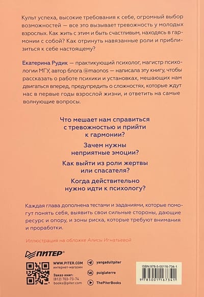 Ekaterina Rudik - a practicing psychologist, MSU Master of Psychology, author of the blog @maonos - wrote this book to talk about the workings of the psyche and the attitudes that prevent us from moving forward, to warn about the difficulties that await us in the first years of adulthood, and to answer the most troubling questions.