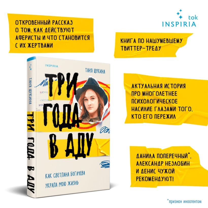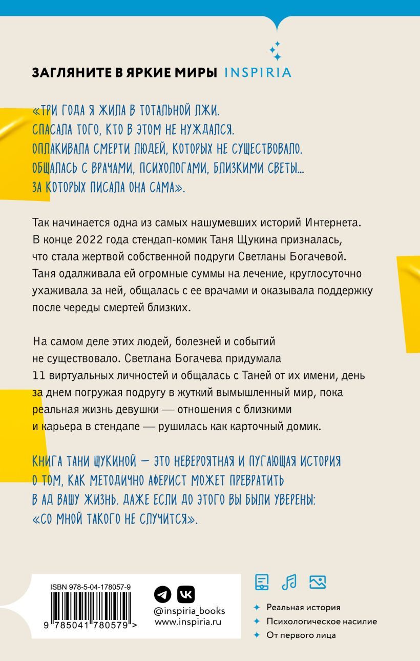 During the three years of their friendship, Svetlana surrounded Tanya with a fictional reality, took control of her finances, ruined her health and psyche, isolated her from her friends, and forced her to emigrate. Tanya Shchukina's book is an incredible and frightening story of how methodically a con artist can make your life a living hell. Even if before that you were sure: "It won't happen to me".