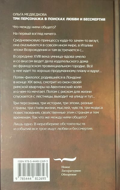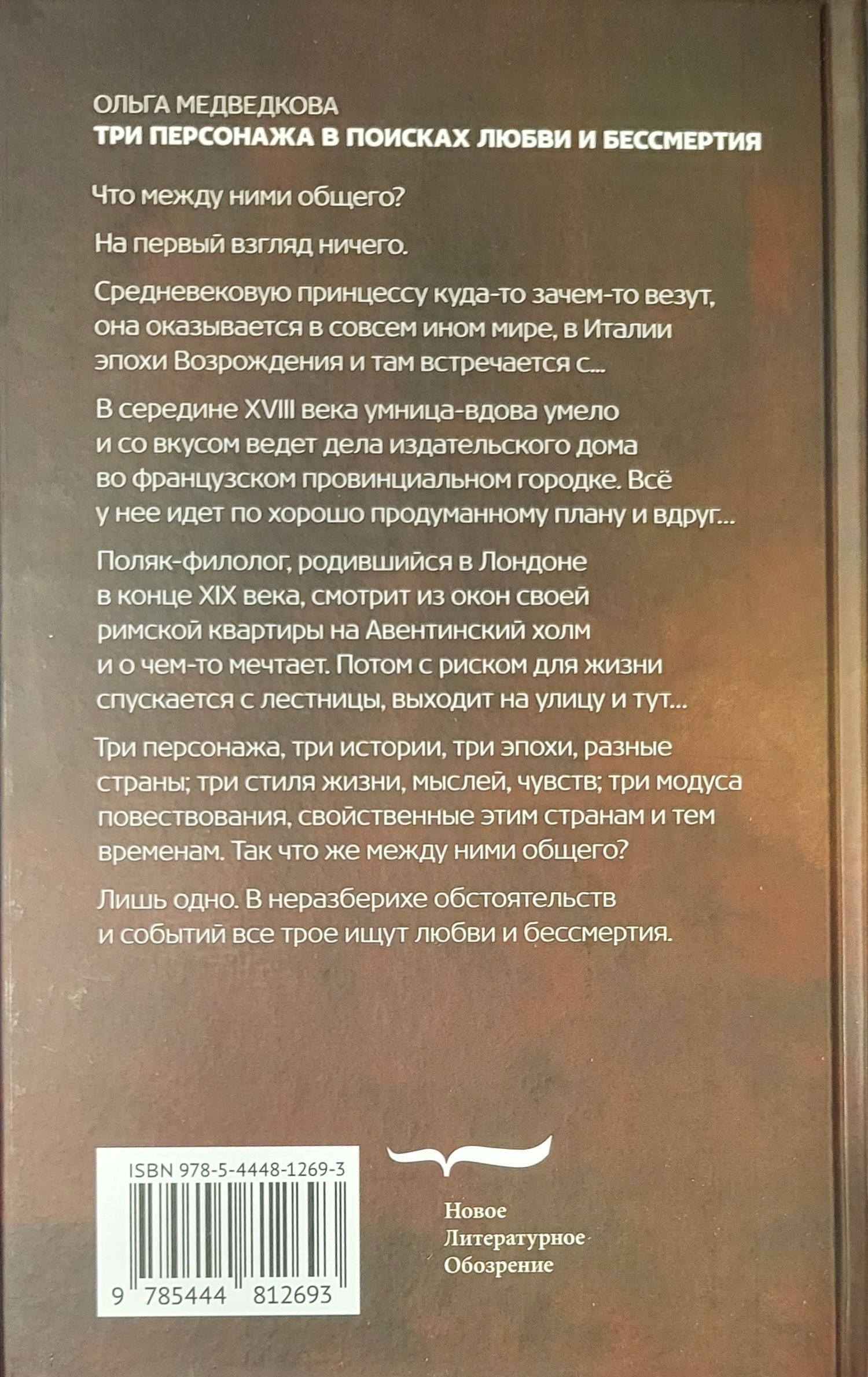 What do they have in common? At first glance, nothing. A medieval princess is taken somewhere for some reason, she finds herself in a completely different world, in Renaissance Italy and there meets with.... In the middle of the XVIII century smart widow skillfully and tastefully conducts business publishing house in a French provincial town. All she goes according to a well thought out plan and suddenly... A Polish philologist, born in London at the end of the XIX century, looks out of the windows of his Roman apartment on the Aventine Hill and dreams of something. Then, at the risk of his life, he descends the stairs, goes out into the street and then ... Three characters, three stories, three eras, three different countries; three styles of life, thoughts, feelings; three modus operandi of narration peculiar to those countries and those times. So what do they have in common? Only one thing. In the confusion of circumstances and events, all three are searching for love and immortality. Olga Medvedkova is a novelist, historian of art and architecture, and senior researcher at the French National Center for Scientific Research.