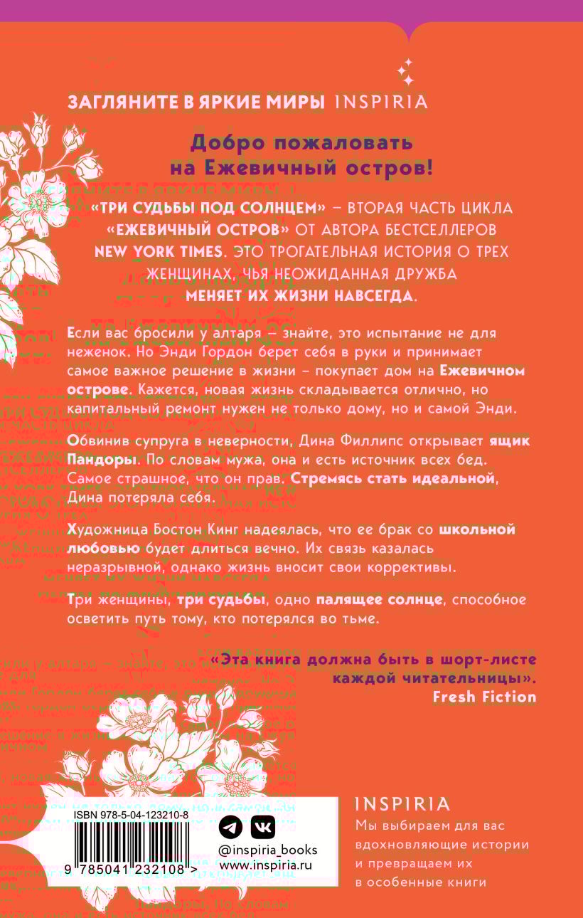 The sea air of Blackberry Island is filled with old secrets, love's turmoil, and a chance for a new beginning. "Three Fates in the Sun" is the second installment of the "Blackberry Island" series from the New York Times bestselling author. It is a heartwarming story about three women whose unexpected friendship changes their lives forever. Welcome to Blackberry Island. No matter how you got here; whether you came by ferry or drove a thousand kilometers by car, it's the perfect place to relax and not rush anywhere. Here locals and visitors alike pick sweet blackberries, spend time with a good book and enjoy the views of the bustling ocean with the sun sinking in every day. If you've been left at the altar, know this ordeal is not for sissies. But Andy Gordon pulls himself together and makes the most important decision of his life - he buys a house on Blueberry Island. The new life seems to be going great, but it's not only the house that needs a major overhaul, but Andy herself. Having accused her husband of infidelity, Dina Phillips opens Pandora's box. According to her husband, she's the source of all the trouble. The worst part is that he's right. In her quest to be perfect, Dina has lost herself. Artist Boston King hoped her marriage to her high school sweetheart would last forever. Their bond seemed unbreakable, but life makes its adjustments. Three women, three destinies, one blazing sun that can light the way for someone lost in darkness.