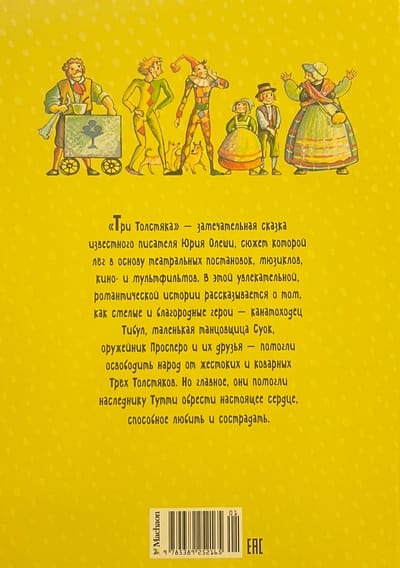 "Three Fat Men" - a wonderful fairy tale by the famous writer Yuri Olesha, the plot of which formed the basis of theater productions, musicals, movies and cartoons. This fascinating, romantic story tells how brave and noble heroes - the tightrope walker Tibul, the little dancer Suok, the armorer Prospero and their friends - helped to free the people from the cruel and insidious Three Fat Men. But most importantly, they helped Tutti's heir to find a true heart capable of love and compassion.