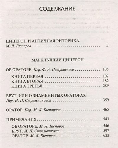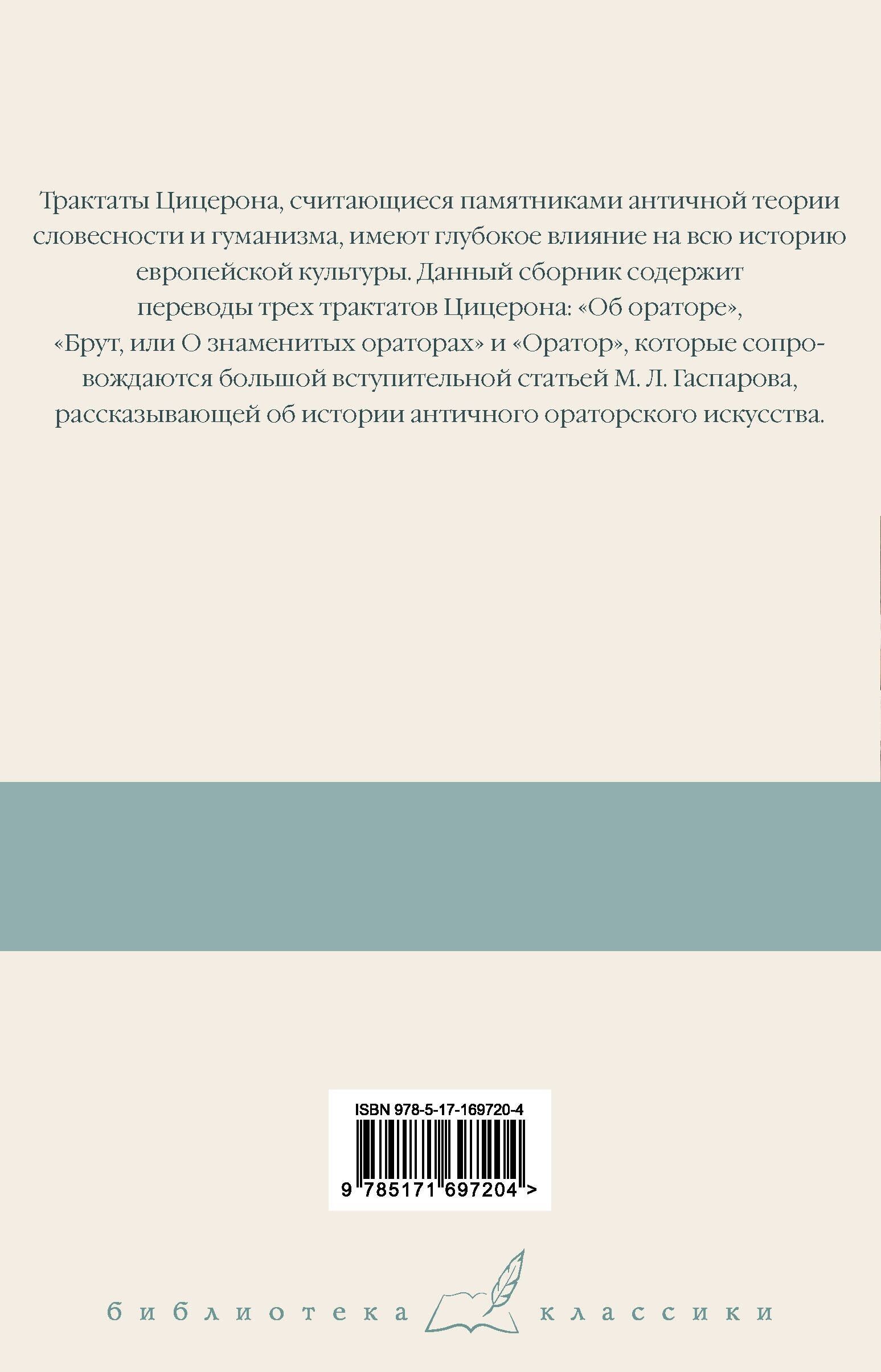 This collection contains translations of three treatises by Cicero: "On the Orator", "Brutus, or On Famous Orators" and "The Orator", which are accompanied by a large introductory article by M. L. Gasparov, telling about the history of ancient oratory.