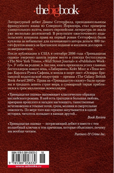 Diana Setterfield's The Thirteenth Tale is a recognized masterpiece of modern English prose, a book that introduced the neo-Gothic genre to a wider audience and prompted Anglo-American critics to speak of a return to the golden age of the British novel, shrouded in the names of Charlotte and Emily Brontë and Daphne du Maurier. This modest schoolteacher's debut novel, the rights to which were purchased for an unprecedented sum for a novice author (800,000 pounds for the British edition, a million dollars for the American edition), outsold the bestsellers of recent years, was instantly translated into several dozen languages, and was honored by reviewers as the new "Jane Eyre." Margaret Lee works in her father's second-hand bookshop. She prefers Dickens and the Brontë sisters to modernity. Margaret is therefore surprised when she receives an offer from Vida Winter, the most famous writer of our time, to become her biographer. After all, Miss Winter is no less famous for her books than for the fact that she has never told a single interviewer a word of truth. And so, within the walls of a gloomy, haunted mansion, Margaret finds herself confronted with a literal Gothic story of twin sisters, one that strangely echoes her own personal story and gradually leads to the solution to a mystery that has driven generations of readers mad—the mystery of "The Thirteenth Tale."