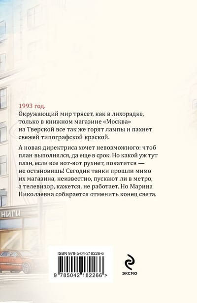 It's 1993. The world around us is shaking like a fever, except in the "Moscow" bookstore on Tverskaya Street, where the lamps still glow and the smell of fresh ink fills the air. And the new headmistress wants the impossible: to fulfill the plan, and on time, too. But what kind of plan is there if everything is about to collapse, if everything is going to slide—no one can stop it! Today, tanks rolled past their store, it's unclear whether they're even allowed on the metro, and the television doesn't seem to be working. But Marina Nikolaevna is planning to cancel the end of the world...