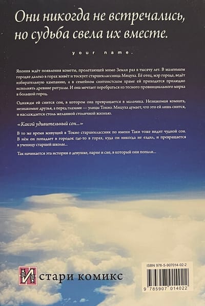 They had never met, but fate brought them together. Japan is waiting for a comet that passes by the Earth once every thousand years. Mitsuha, a high school girl, lives in a small town far away in the mountains. Her father, the town's mayor, is running an election campaign, and in the family Shinto temple she has to perform ancient rituals in public. And she dreams of moving from her cramped provincial world to the big city. One day she has a dream in which she turns into a boy. An unfamiliar room, unfamiliar friends, and the streets of Tokyo in front of her eyes. Mitsuha thinks she is only dreaming and enjoys the much desired life in the capital. "What an amazing dream..." At the same time, a high school student named Taki, who lives in Tokyo, also has a wonderful dream. In it, he finds himself in a town somewhere in the mountains where he has never traveled, and he turns into a high school student... So begins this story of a girl, a boy, and the dream they fell into....