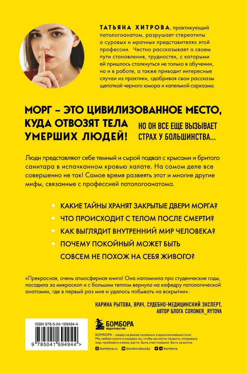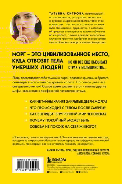 Many people think of pathologists as cold-blooded people making dark jokes while cutting up another corpse, and the pathology department as a dark crypt with an oppressive atmosphere. But, opening the book "Your Last Doctor", you will be amazed at how much the myths about this profession are far from the truth. This is a story of a novice pathologist Tatiana Khitrova about the realities of working in the morgue, unusual cases of practice and difficulties that she had to face on the professional path. The book includes everyday life in the pathology department with their complex medical tasks and inevitable routine, and simple human stories, and interesting medical facts, and, of course, humor, without which in this business is nowhere.