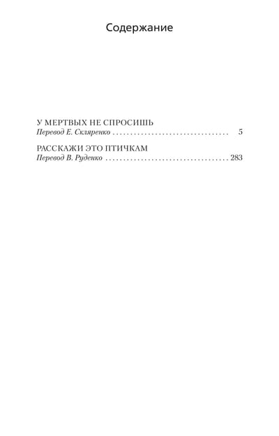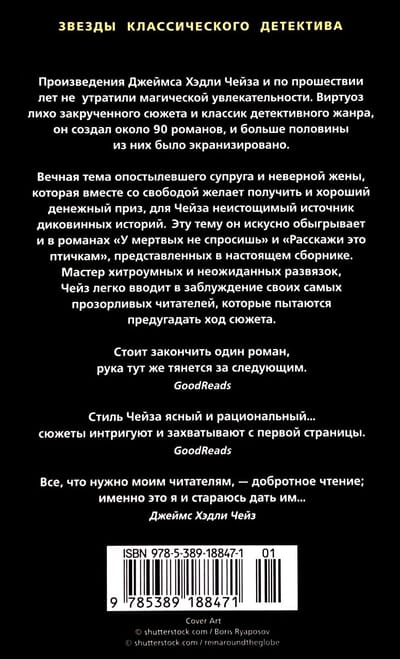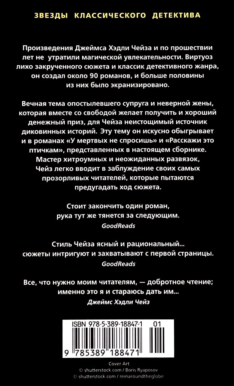 The works of James Hadley Chase and over the years have not lost magical charm. The virtuoso of a famously twisted plot and a classic of the detective genre, he created about 90 novels, more than half of which were filmed. The eternal theme of a disfigured spouse and an unfaithful wife who, along with freedom, wants to receive a good monetary prize, for Chase is an inexhaustible source of outlandish stories. He skillfully plays this theme in the novels “You can’t ask the dead” and “Tell this to the birds”, presented in this collection. Master of clever and unexpected endings, Chase easily misleads his most prescient readers who try to predict the course of the plot.