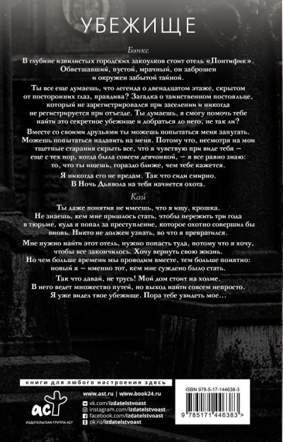 Hidden places, chases and forbidden games return...Banks. Deep in the winding nooks and crannies of the city stands the Pontifex Hotel. Dilapidated, empty, and gloomy, it is abandoned and surrounded by a forgotten mystery.Do you still think the legend of the twelfth-floor hidden room is true? The mystery of the mysterious guest who doesn't check in when he checks in and never checks out when he leaves. You think I can help you find this secret hideout and get to him, don't you? You and your friends can try to intimidate me. You can try to pressure me. Because despite my futile efforts to hide everything I've felt about you since I was a girl, I still know that what you're looking for is closer than you think. I'll never betray it. So sit tight. You'll be hunted on Devil's Night. Kai. You have no idea what I'm looking for, Baby. You don't know what I had to become to survive three years in prison for a crime I would gladly commit again. No one can know what I've become.I need to find that hotel, I need to get there because I want it to be over. I want my life back. But the more time we spend together, the more it's clear that the new me is exactly who I was meant to be.So come on, don't chicken out! My house is on a hill. There are many paths to it, but it's not easy to find your way out. I've already seen your hideout. It's time you saw mine.