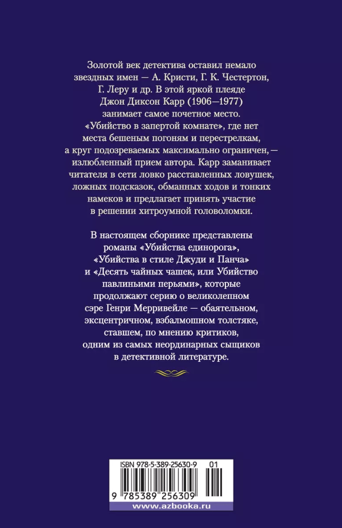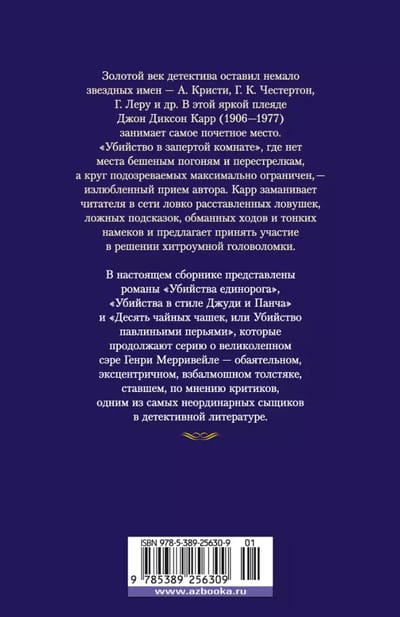 The golden age of the detective left many star names - A. Christie, G. K. Chesterton, G. Leroux, etc. In this bright pleiad John Dickson Carr (1906-1977) takes the most honorable place. "Murder in a locked room", where there is no room for frantic chases and shootings, and the circle of suspects as limited as possible - a favorite technique of the author. Carr lures the reader into a network of cleverly placed traps, false clues, deceptive moves and subtle hints and offers to take part in solving the cunning puzzle. This collection includes the novels "The Unicorn Murders", "The Judy and Punch Murders" and "Ten Tea Cups, or Murder by Peacock Feathers", which continue the series about the magnificent Sir Henry Merrivale - charming, eccentric, flighty fat man, who became, according to critics, one of the most extraordinary detectives in detective literature.