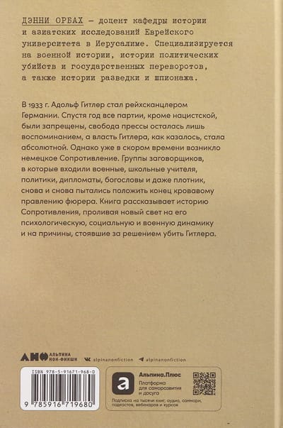 In 1933, Adolf Hitler became Chancellor of Germany. A year later, all parties except the Nazi Party were banned, press freedom was a distant memory, and Hitler's power seemed absolute. However, the German resistance soon emerged. Groups of conspirators, including soldiers, schoolteachers, politicians, diplomats, theologians, and even a carpenter, repeatedly attempted to end the Führer's bloody reign. This book tells the story of the resistance, shedding new light on its psychological, social, and military dynamics, as well as on the reasons behind the decision to assassinate Hitler. Drawing on specific observations, the author draws more general conclusions: why do some people choose active resistance, despite mortal risk, while others do not? Who is most likely to become a resistance fighter? And what can we learn about the complex and changing motivations that drive people to this path?