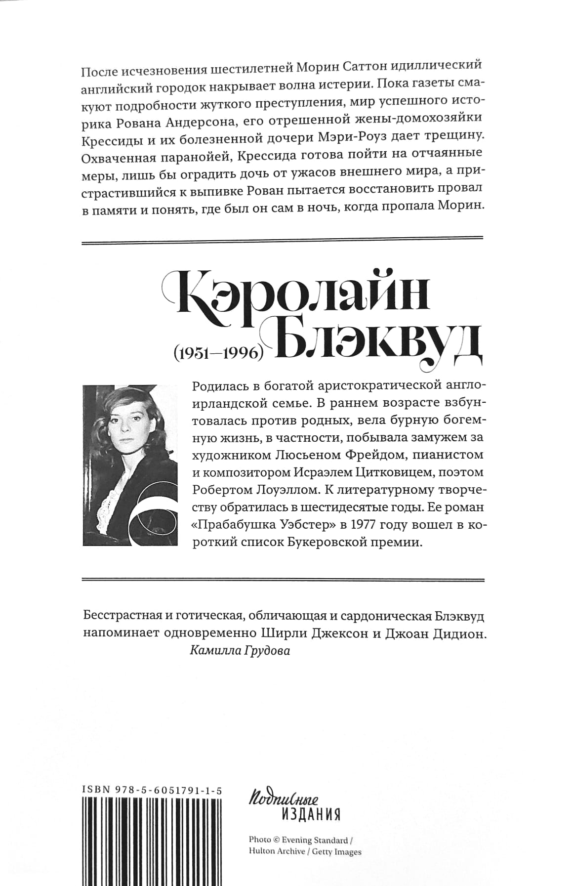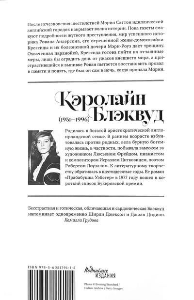 Caroline Blackwood (1931–1996) was born into a wealthy, aristocratic Anglo-Irish family. At an early age, she rebelled against her family and led a turbulent, bohemian life, including marriages to artist Lucian Freud, pianist and composer Israel Citkowitz, and poet Robert Lowell. She turned to literary writing in the 1960s. Her novel "Great-Grandmother Webster" was shortlisted for the Booker Prize in 1977.