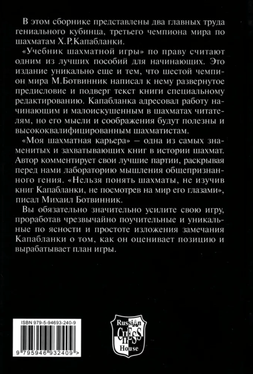 This book by the brilliant Cuban, third World Chess Champion, J.R. Capablanca, is rightfully considered one of the best textbooks for beginners. This edition is also unique in that the sixth World Champion, M. Botvinnik, wrote a detailed preface and subjected the entire text to special editing. Capablanca addressed his remarkable book to beginners and readers with little experience in chess, but some of his thoughts and ideas will be useful even for highly skilled chess players.