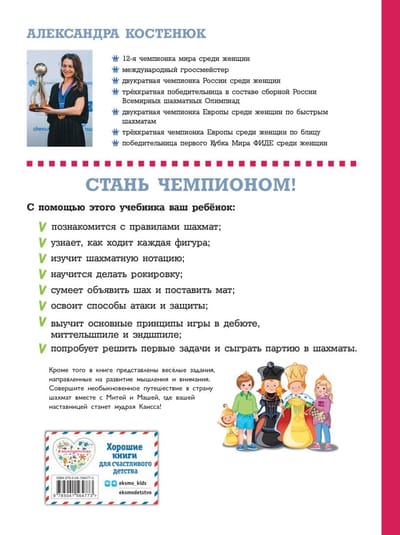 With the help of this textbook your child: - will get acquainted with the rules of chess; - will learn how each piece moves; - will study chess notation; - will learn how to castling; - will be able to declare check and checkmate; - will learn the methods of attack and defense; - will learn the basic principles of play in the opening, middlegame and endgame; - will try to solve the first problems and play a game of chess. In addition, the book contains fun tasks aimed at developing thinking and attention. Take an extraordinary journey to the land of chess together with Mitya and Masha, where the wise Kaissa will be your mentor!