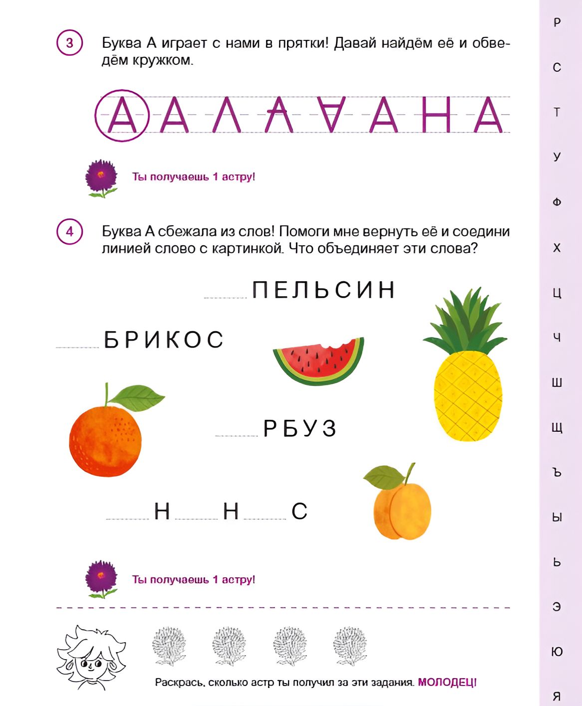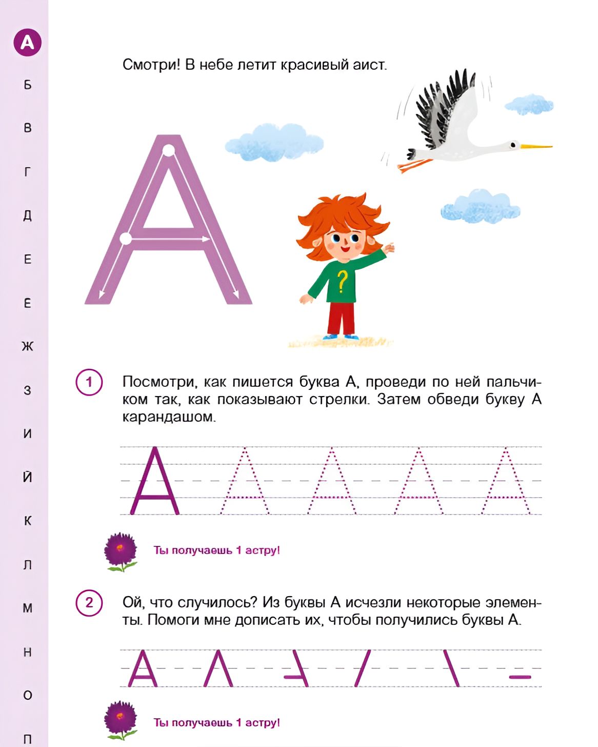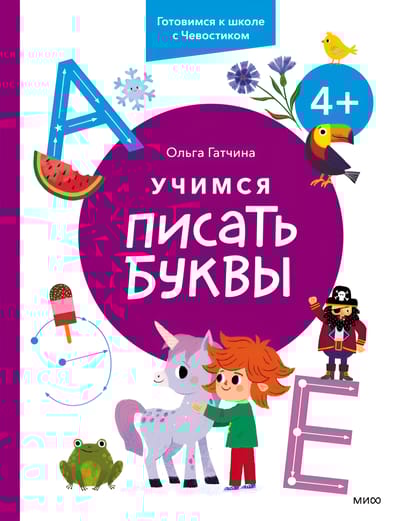 Each letter has several different tasks, which gradually become more difficult. First, the child is asked to trace the letter with his finger, then with a pencil, then complete the missing elements of the letters, and only at the end write the letter into the word independently. In addition, there is a task to remember the graphic image of the letter.