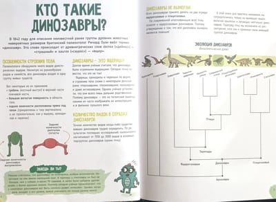 In the encyclopedia "Amazing Dinosaurs" on each page the young reader will find a new topic: when did they live (Triassic, Jurassic, Cretaceous periods); where did they live (in the forest, in the desert, in the swamp); what size were they (from 20 cm to 37 meters); what was the skin of dinosaurs, color, food preferences, how did they communicate with each other and much, much more!
