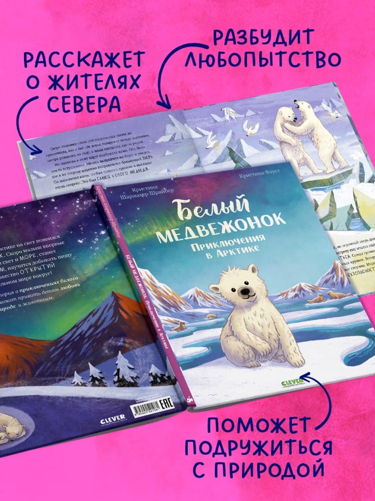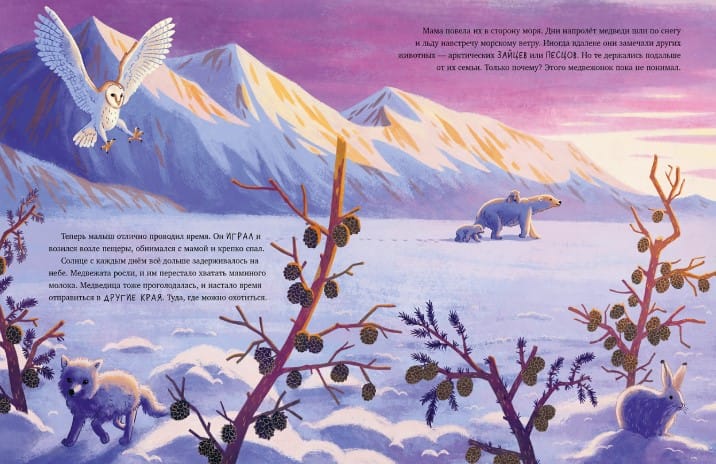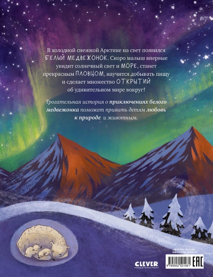 A polar bear cub was born in the cold snowy Arctic. Soon the baby will see sunlight and the sea for the first time, will become an excellent swimmer, will learn to get food and will make many discoveries about the amazing world around! The book with a story about the life of animals of the North will appeal to children 2, 3, 4, 5 years old and will teach them to love nature, be interested in the world around them, and make discoveries.