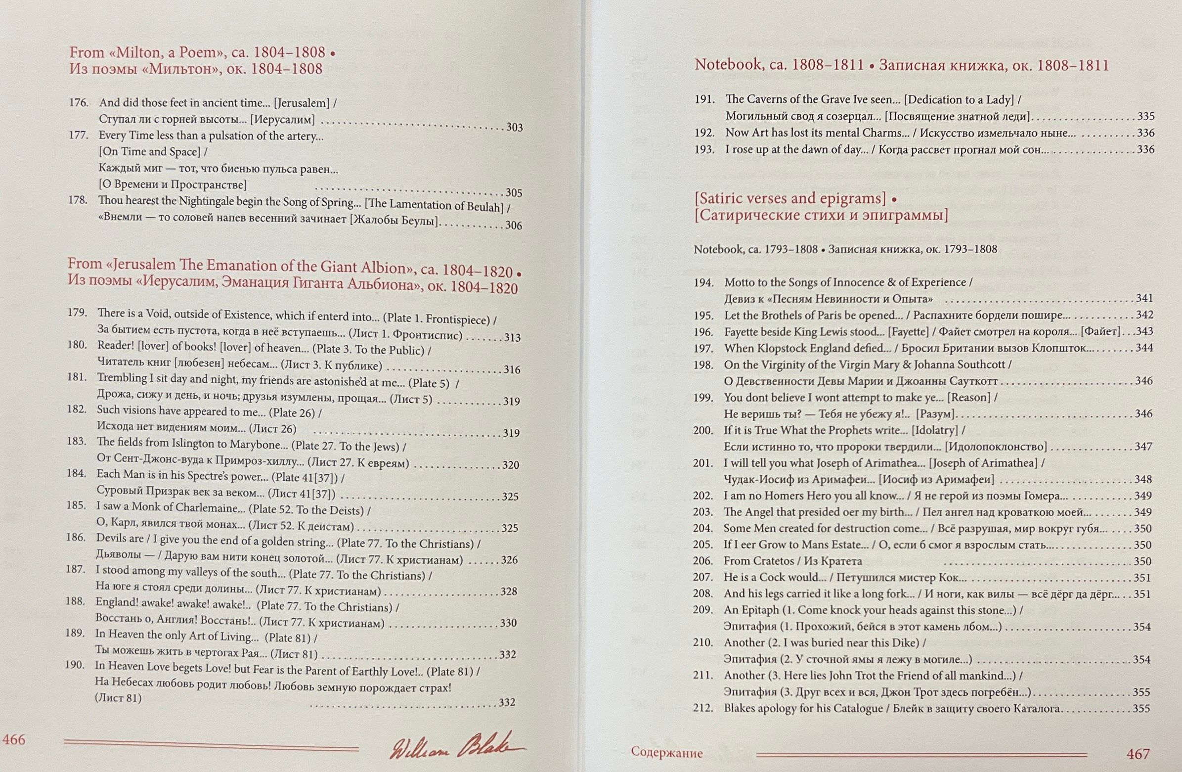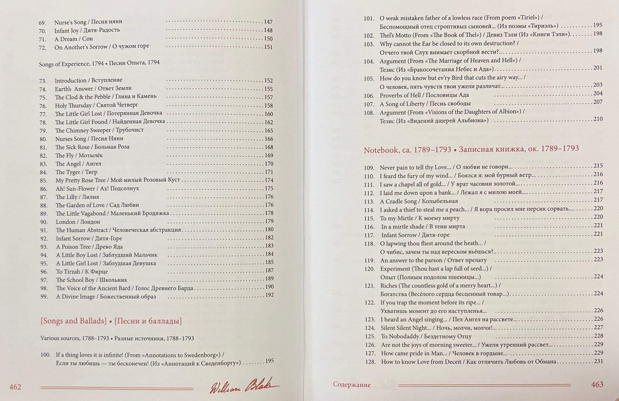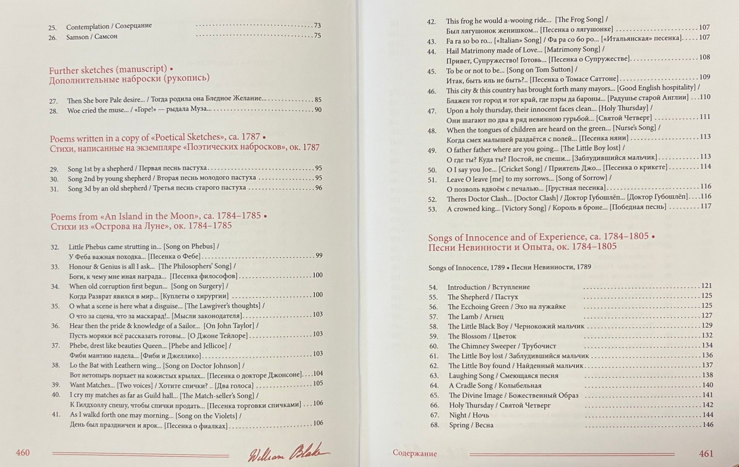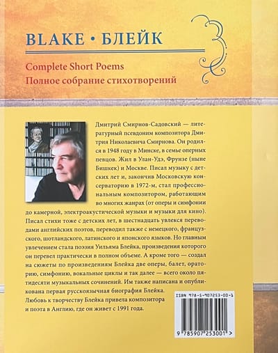The book includes poems by William Blake (1759-1827) in translations by D. Smirnov-Sadovsky. Blake's poetry collections are fully represented here: those collected by his friends, such as "Poetical Sketches", and those that he compiled, engraved and printed by his own hand, such as the famous "Songs of Innocence and Experience". Also fully translated are Blake's poems that have survived in drafts and manuscripts, including his "Notebook," also known as the Rossetti Manuscript, and a collection of ten ballads called the Pickering Manuscript, as well as poems from letters, verse epistles, dedications, satirical poems, epigrams, fragments, etc. For the sake of completeness, we include poetic inclusions from prose texts, annotations to books read, and Blake's "prophetic" poems, which he never thought of publishing. Work on Russian translations of these texts was begun by the translator in 1967 and continued for more than half a century. Many of these translations are published for the first time.