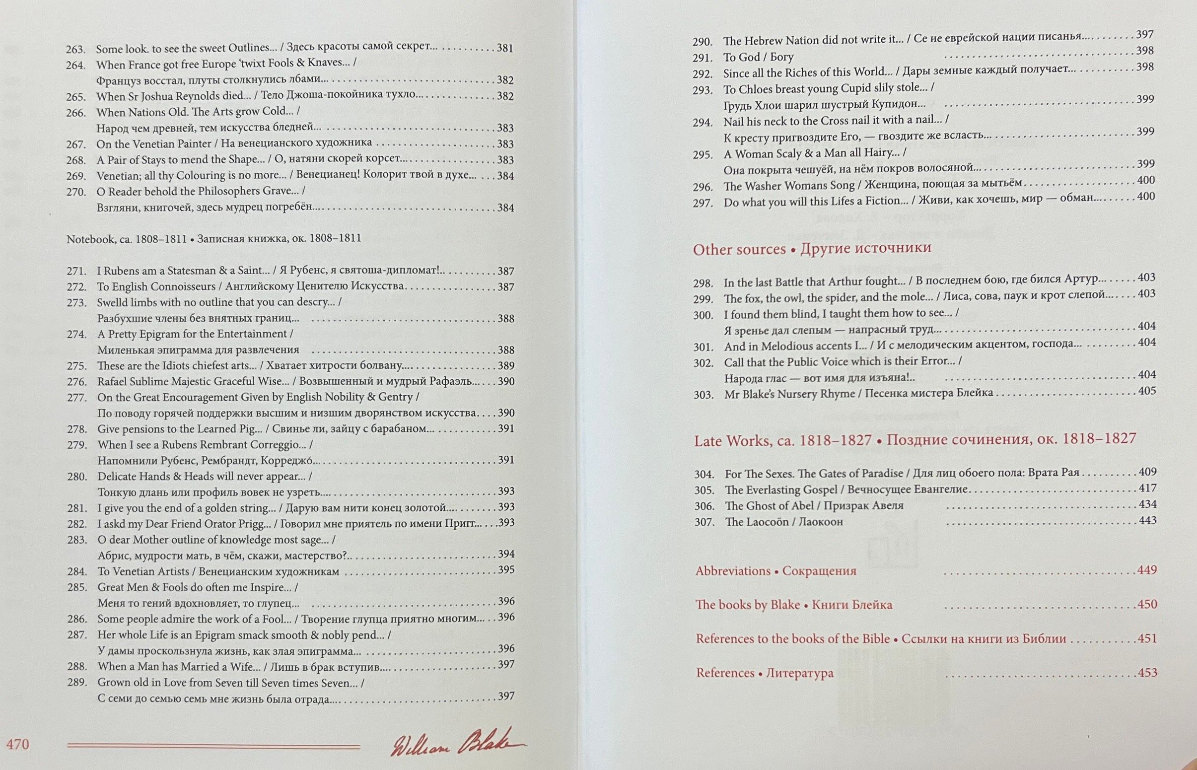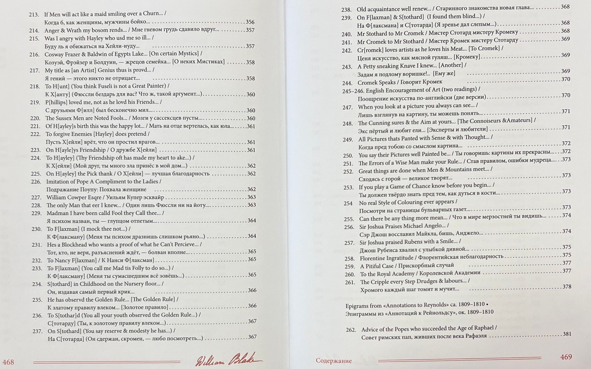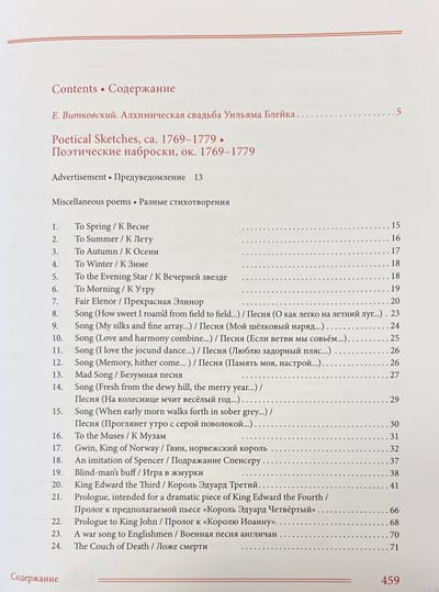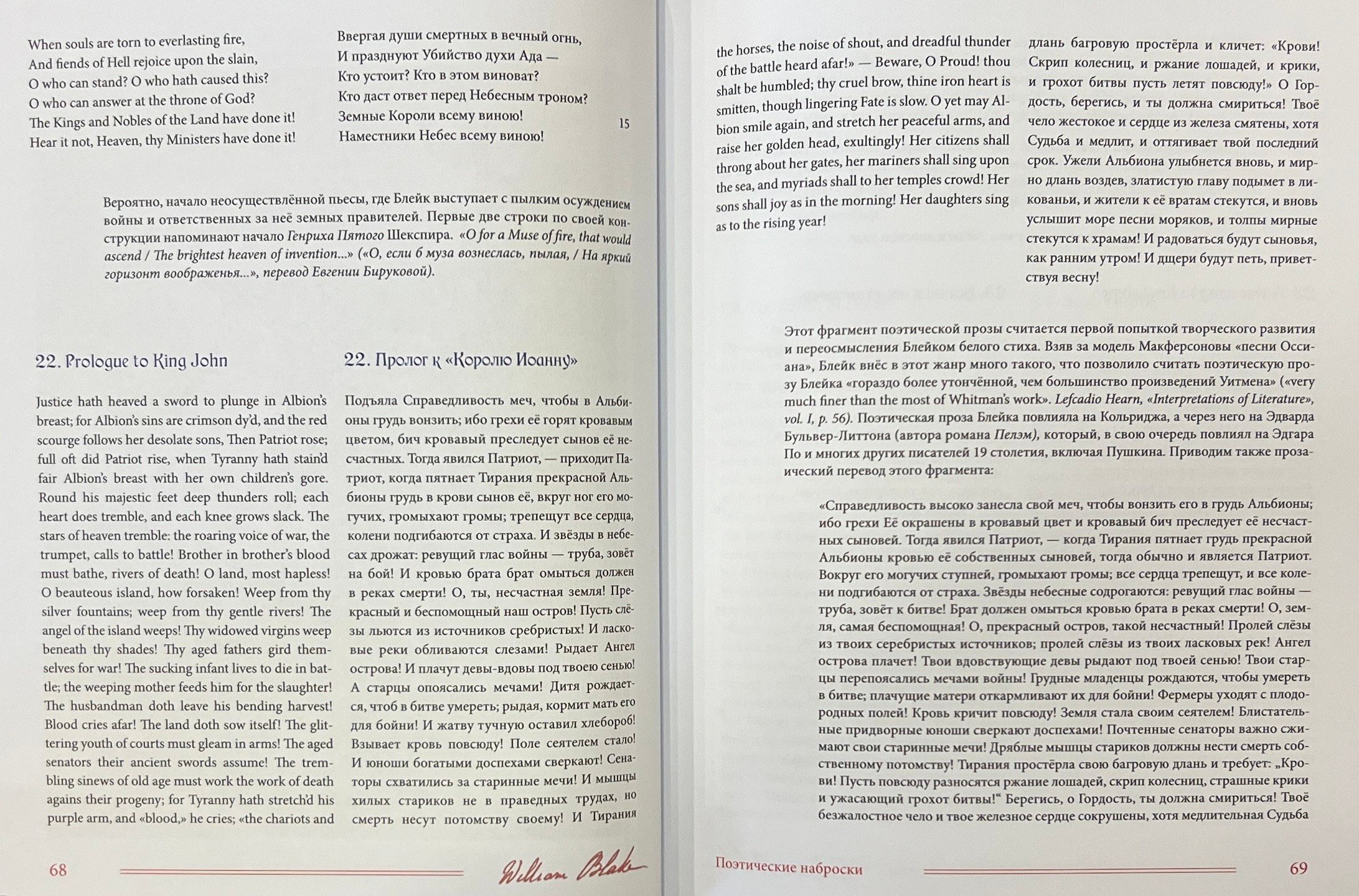 The book includes poems by William Blake (1759-1827) in translations by D. Smirnov-Sadovsky. Blake's poetry collections are fully represented here: those collected by his friends, such as "Poetical Sketches", and those that he compiled, engraved and printed by his own hand, such as the famous "Songs of Innocence and Experience". Also fully translated are Blake's poems that have survived in drafts and manuscripts, including his "Notebook," also known as the Rossetti Manuscript, and a collection of ten ballads called the Pickering Manuscript, as well as poems from letters, verse epistles, dedications, satirical poems, epigrams, fragments, etc. For the sake of completeness, we include poetic inclusions from prose texts, annotations to books read, and Blake's "prophetic" poems, which he never thought of publishing. Work on Russian translations of these texts was begun by the translator in 1967 and continued for more than half a century. Many of these translations are published for the first time.