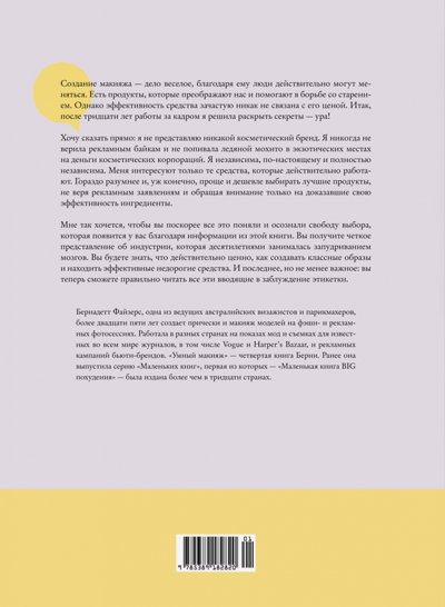 Beauty trends change very quickly. Sometimes it can be difficult to make sense of the loud advertising claims and find what's right for you among the huge range of cosmetics. One of the leading foreign makeup artists, who has worked with Vogue and Harper's Bazaar magazines and a number of beauty brands, author of successful books Bernadette Fizers shares the secrets of choosing and the most effective use of decorative and care cosmetics. Composition, properties, peculiarities of storage, methods and techniques of application - this book is an excellent guide in the world of creams, masks, mascara, lipstick, shadows, bases and many other means - faithful allies of female beauty. "Skin care products and decorative cosmetics affect our emotional state almost more than our appearance. They make us feel a certain way about ourselves. In this book, I want to share with you the wisdom I've gained over the years in the beauty industry. By the time you finish reading this book, you will have learned to look at what you buy in a new way. You'll realize which products work and which ones don't, even though you fanatically apply them twice a day. You'll know what's really valuable, how to create cool looks and find effective inexpensive products. And you'll be able to read labels correctly. How much time and money will you save? A lot!" (Bernadette Feathers)