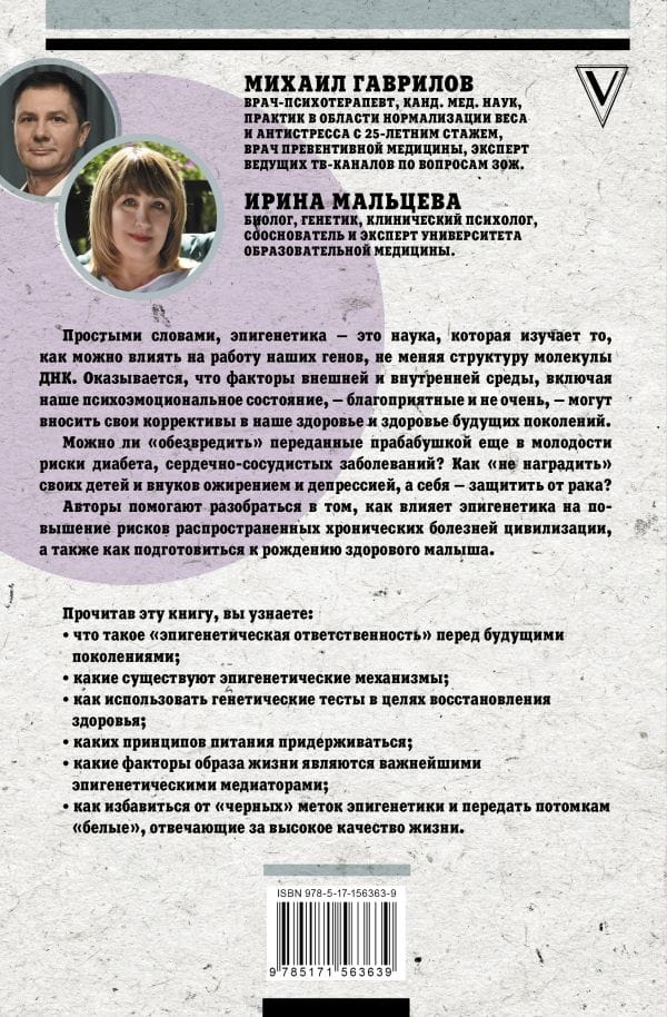 Mikhail Gavrilov is a doctor-psychotherapist, candidate of medical sciences, practitioner in the field of weight normalization and anti-stress with 25 years of experience, doctor of preventive medicine, expert of leading TV channels on healthy lifestyle.Irina Maltseva is a biologist, geneticist, clinical psychologist, co-founder and expert of the University of Educational Medicine.In simple words, epigenetics is a science that studies how we can influence the work of our genes without changing the structure of the DNA molecule. It turns out that factors of external and internal environment, including our psycho-emotional state - favorable and not so favorable - can make adjustments in our health and the health of future generations.Is it possible to "neutralize" the risks of diabetes, cardiovascular diseases passed on by great-grandmother in her youth? How not to "reward" your children and grandchildren with obesity and depression, and protect yourself from cancer? The authors help to understand how epigenetics affects the increase in the risks of common chronic diseases of civilization, as well as to prepare for the birth of a healthy baby.