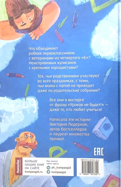 The stories from Victoria Lederman's collection "No Lessons!" are dedicated to elementary school students, from first to fourth grade. These children still have much to learn: patience and discipline, self-advocacy, and diplomacy. And unpleasant surprises are already raining down on them! For example, their beloved French teacher—the one who never assigns or checks anything—is replaced by a strict and demanding one. Or the disgusting Miron Solomatin gives you the offensive nickname "Plyushka" (Curly Dough)—just because you didn't let him cheat. Do you even want to go to school when this happens? You just want to scream at the top of your lungs: "There will be no lessons!"