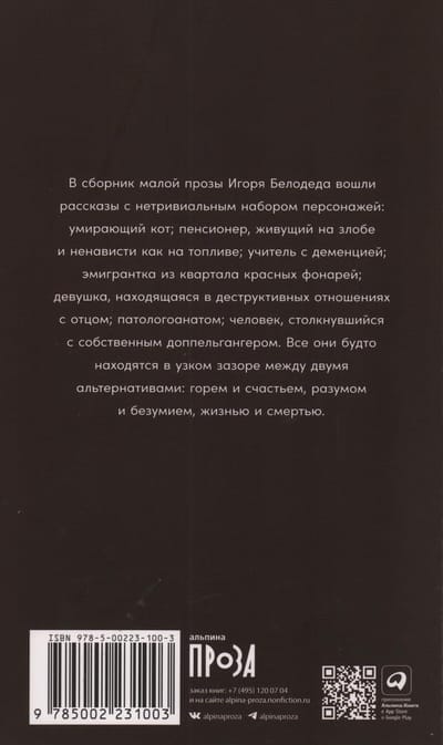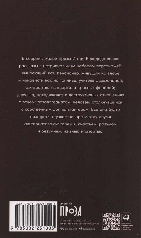 Igor Beloded's collection of short prose includes stories with a non-trivial set of characters: a dying cat; a pensioner living on anger and hatred as fuel; a teacher with dementia; an emigrant from the red light district; a girl in a destructive relationship with her father; a pathologist; a man confronted with his own doppelgänger. It is as if they are all in a narrow gap between two alternatives: grief and happiness, reason and madness, life and death.