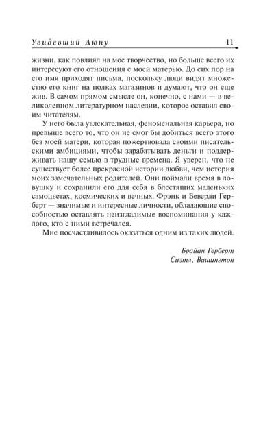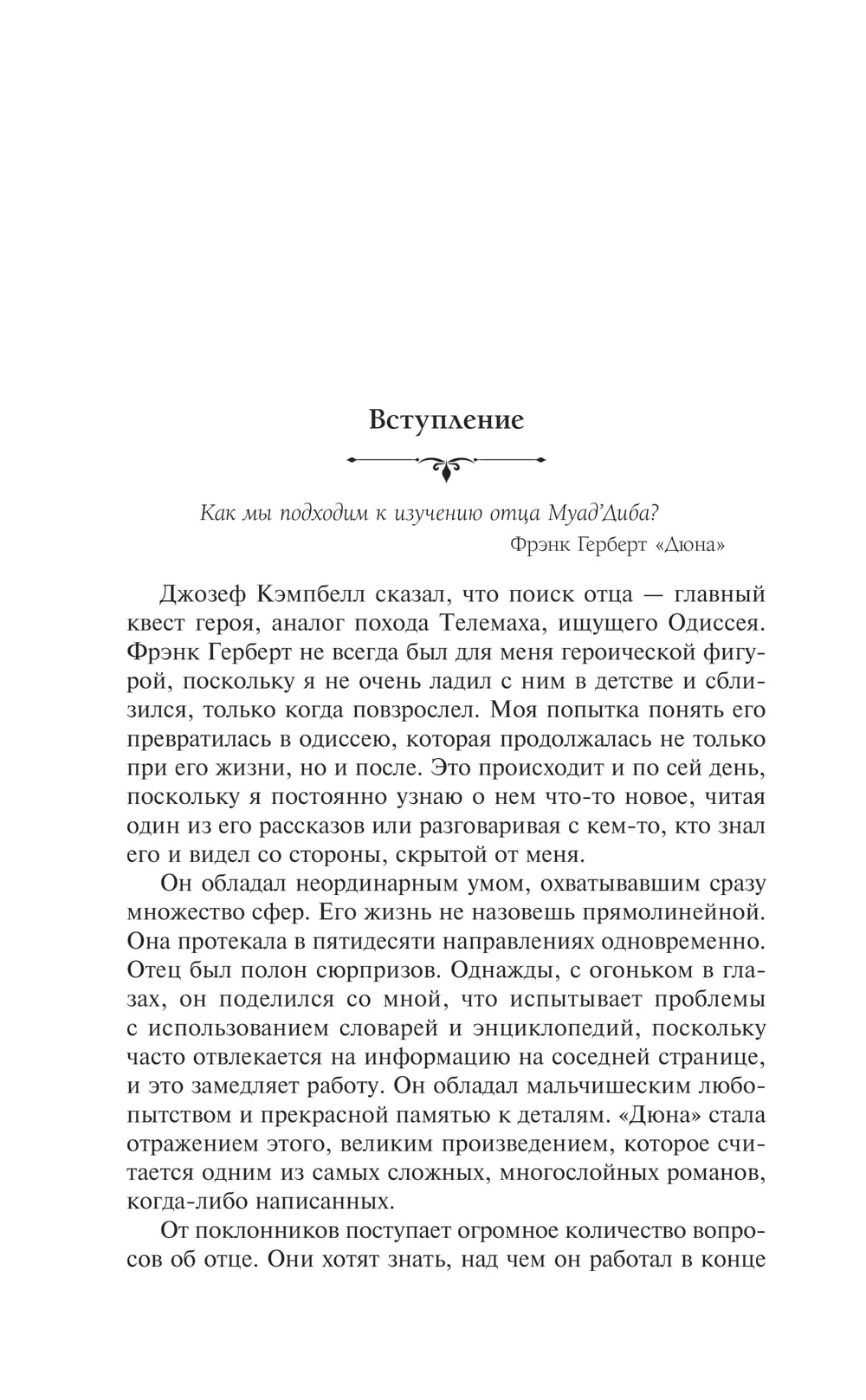 Frank Herbert's famous Dune epic has captured the imagination of generations of readers. The books have sold millions of copies worldwide and have been filmed many times. Known primarily for Dune, Frank Herbert is the author of more than twenty books, including the novels Green Brain, Santaroga Valley, The White Plague, and The Dosadi Experiment. Brian Herbert, Frank's eldest son, tells the story of his father's fate. Having announced at the age of eight that he would become a writer, Frank Herbert worked as a television cameraman, radio host, journalist, and editor of several newspapers throughout his life, while simultaneously writing. But he achieved real success only after the publication of Dune in 1965. Brian Herbert writes about these years in a fascinating and sincere manner.