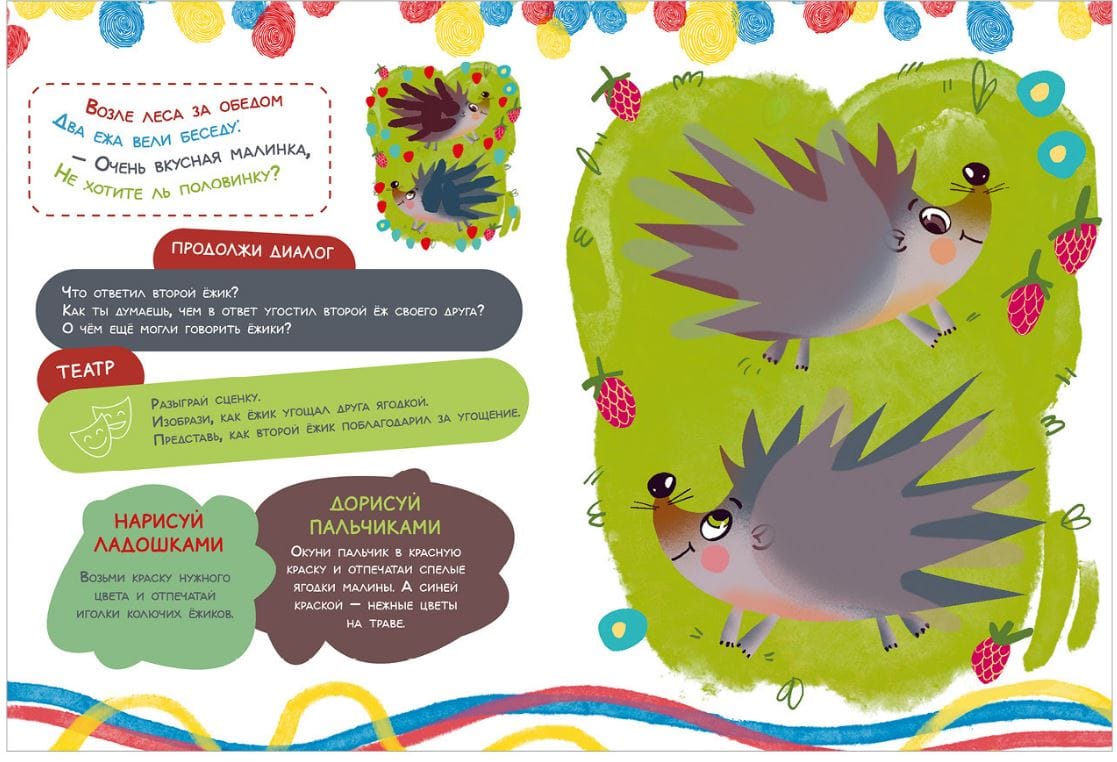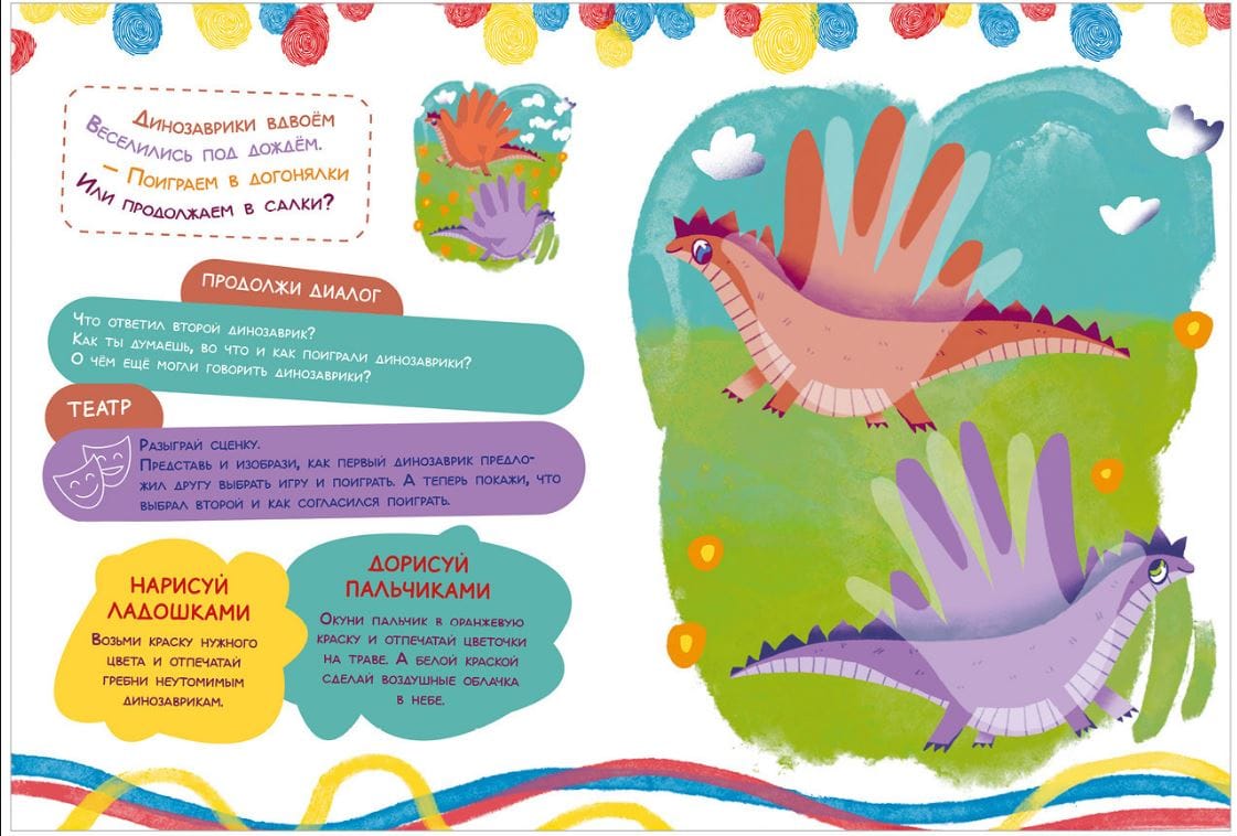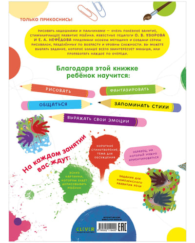 For one lesson on the book "Draw palms and fingers" the child finishes the sketch of the picture, learns a short rhythmic poem. You will also have a topic to discuss after class.