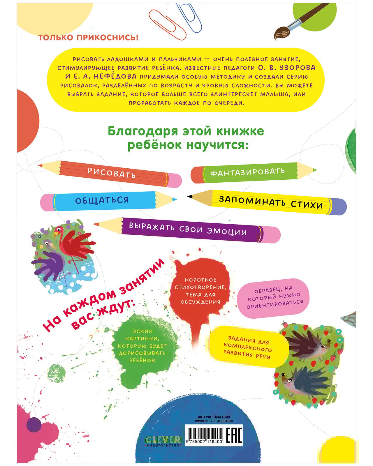 “Draw with palms and fingers” is a notebook with tasks that will captivate your baby and help him with the development of fine motor skills, speech, finger dexterity and coordination, as well as memory and attention.