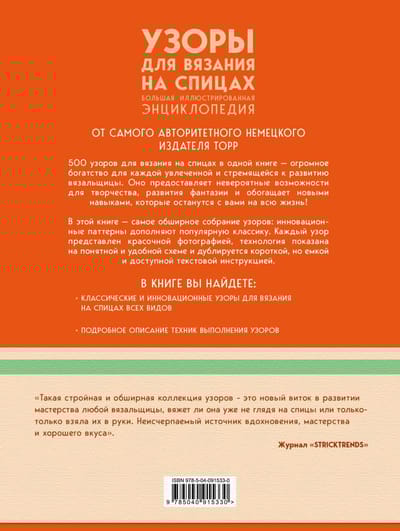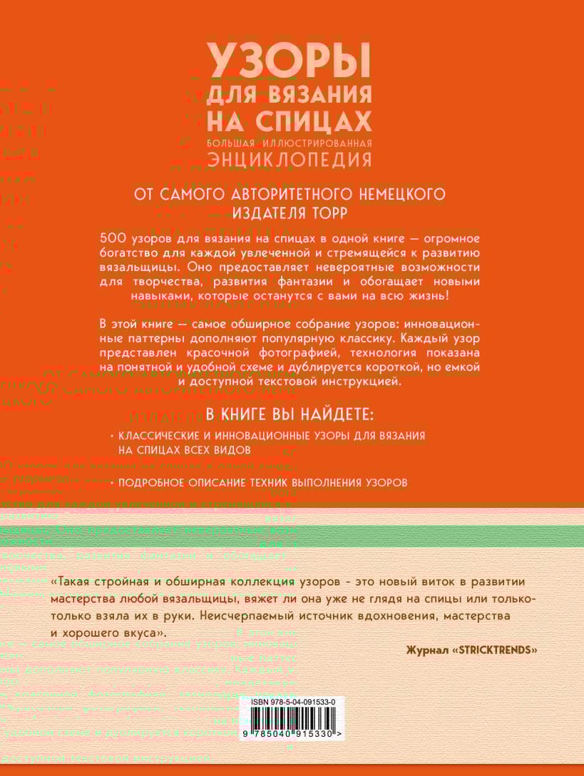 A new large encyclopedia of knitting on needles from the most authoritative German publisher TORR! This time you will find in the book a vast and amazingly diverse collection of 500 patterns for knitting on needles of all kinds. Classic, modern, innovative. Each pattern is provided with a detailed description and clear, clear scheme.